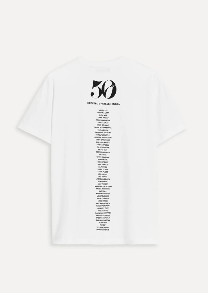 Tra i pezzi must-have, spicca una t-shirt commemorativa con i ritratti delle 50 muse protagoniste della campagna, pensata come oggetto da collezione per gli amanti del marchio e per gli insider del fashion system.