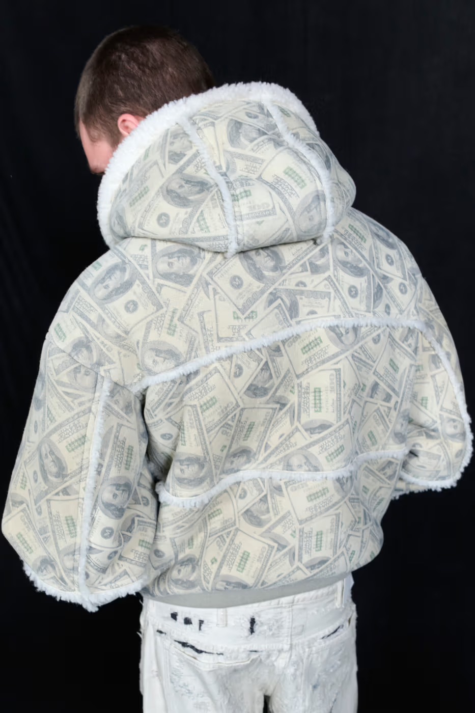 La collezione tenta di unire questi due mondi attraverso capi d’impatto: giacche in pelle con grafiche iperrealistiche, bomber con stampe di banconote, denim reinterpretato. Ma in molti casi questa unione non si percepisce come dialogo, quanto piuttosto come sovrapposizione. Il risultato non amplifica il meglio di entrambi i brand, ma ne diluisce i codici.