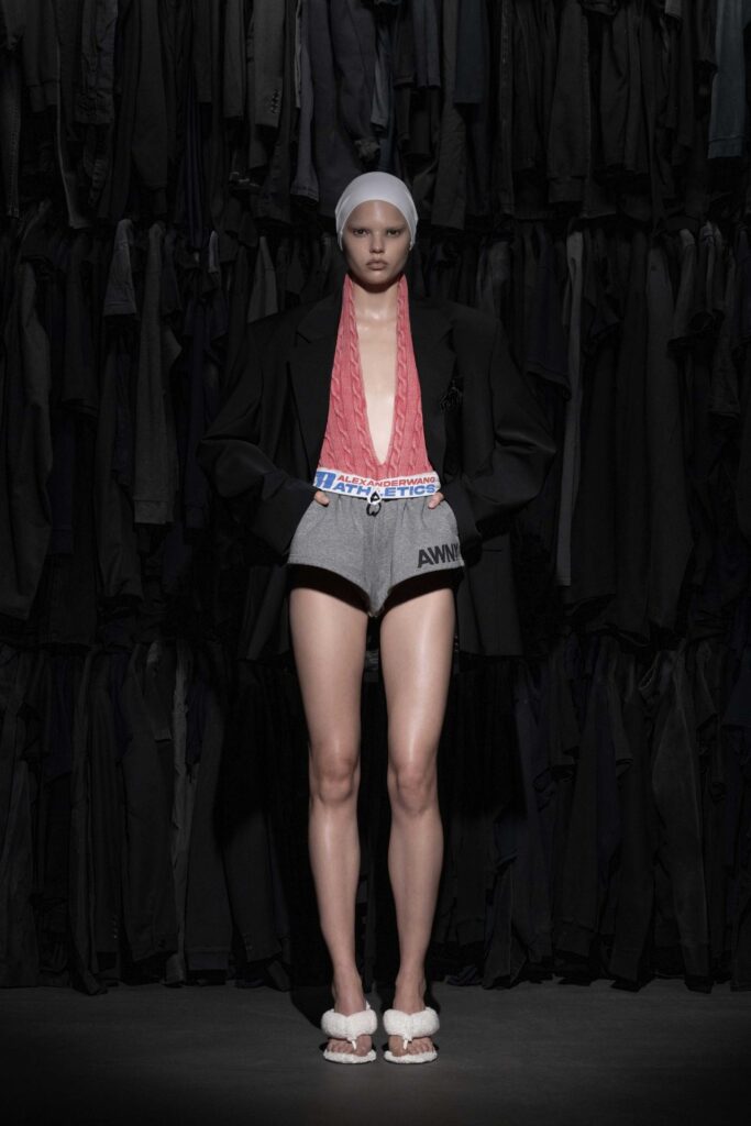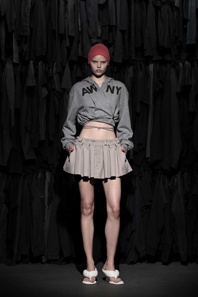 I loghi, sempre presenti, vengono reinventati attraverso tessuti innovativi, mentre il loungewear acquista una nuova dimensione con texture in felpa trasformate in outfit da sera. Tra gli elementi più originali della collezione spicca la fusione di materiali inaspettati: pantaloni sartoriali con coulisse stile jogger, creando un perfetto equilibrio tra sofisticazione e comodità. Questo mix tra sport e urbanwear non solo rispecchia l’identità di Wang, ma risponde anche alla crescente domanda di capi versatili e di carattere.