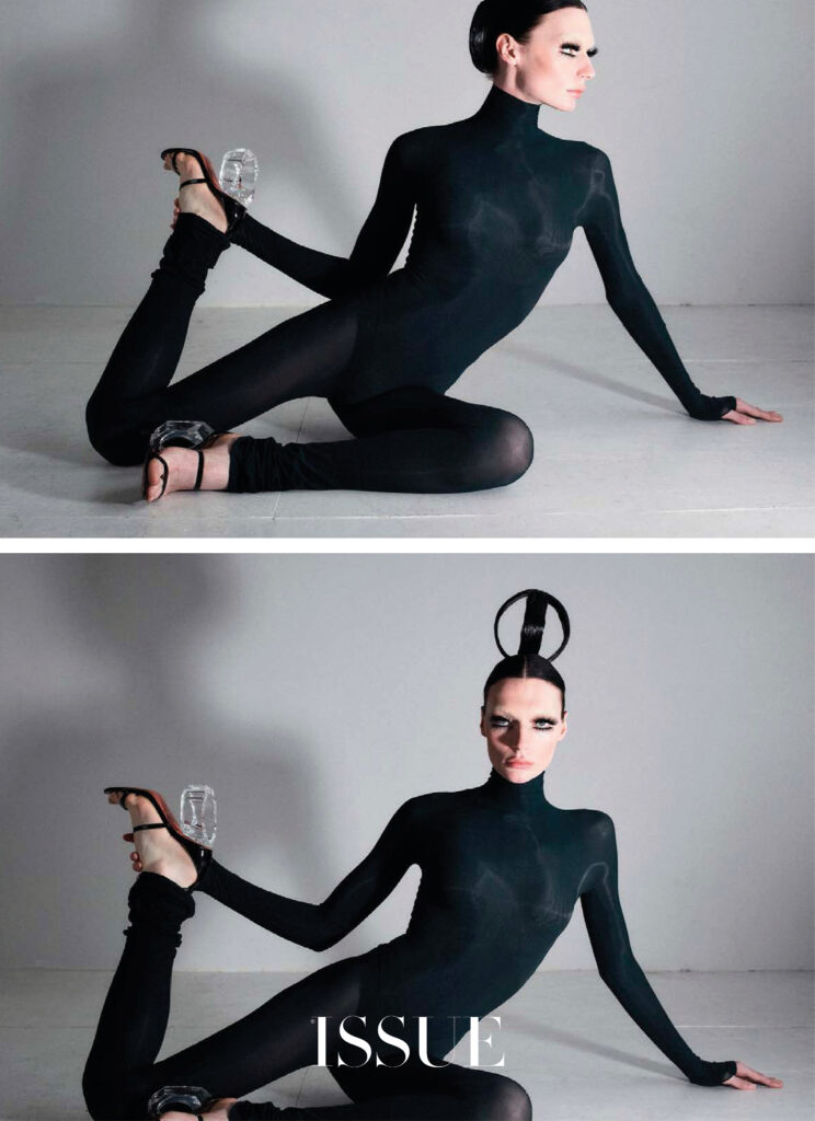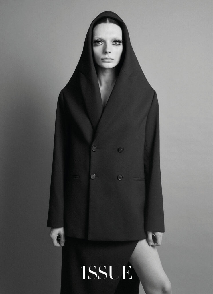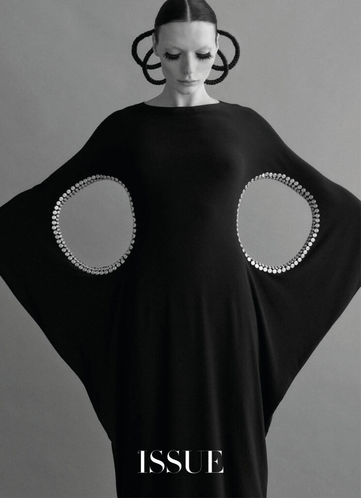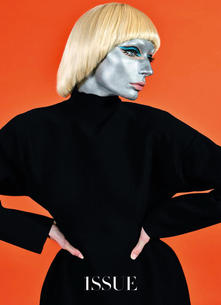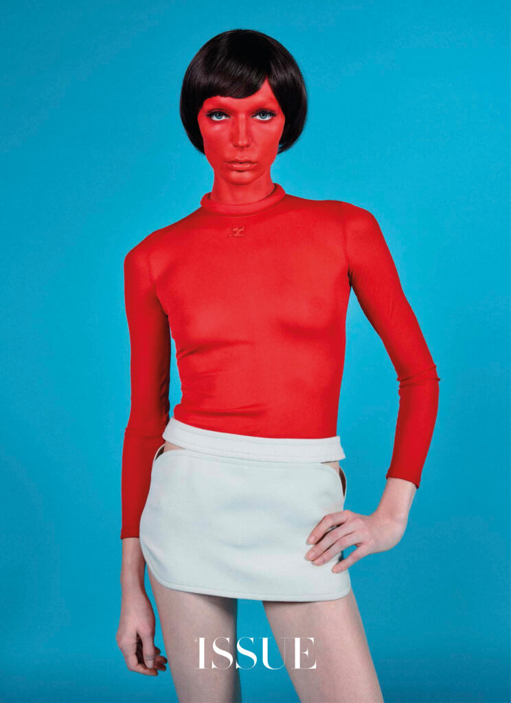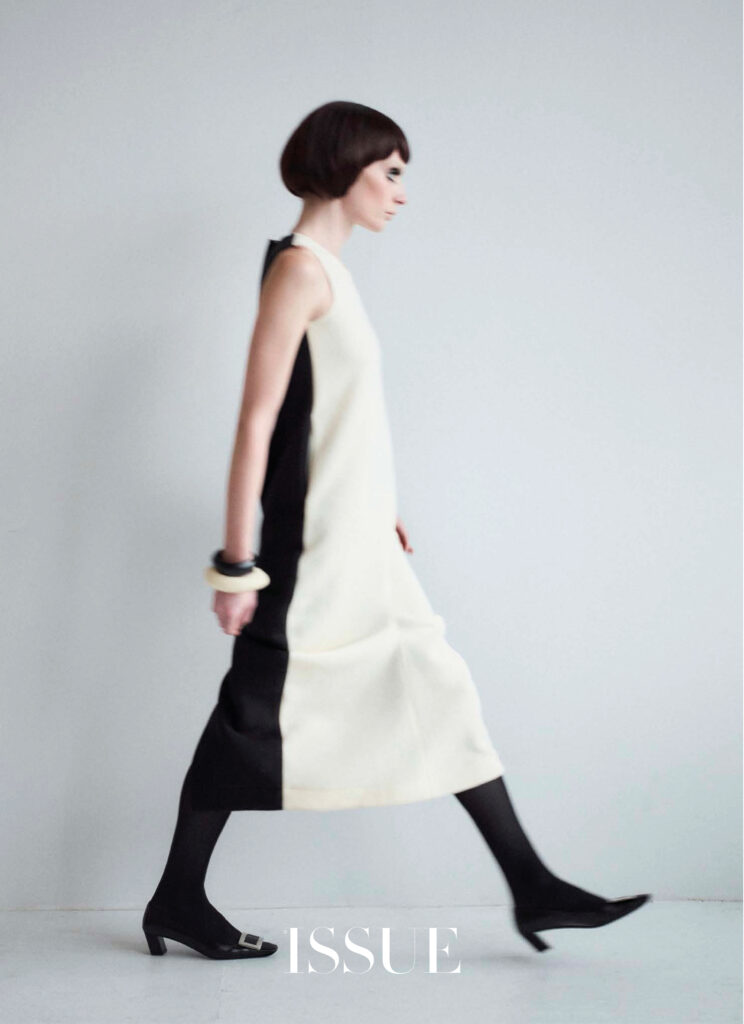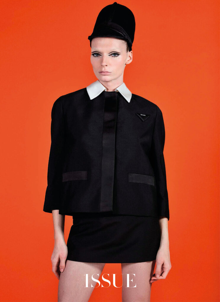 Un viaggio attraverso il passato e nove immagini del presente. Anche se potrebbe sembrare, non è Twiggy la protagonista di queste pagine, sebbene la sua essenza abiti ogni look, ogni posa e ogni movimento. Un taglio pixie che sfiora il bob nella sua lunghezza e la peculiare espressione dello sguardo dell’icona degli anni Sessanta: le ciglia inferiori fortemente delineate, con un mascara nero e un effetto che oggi conosciamo come ‘twigs’. Eyeliner grafici e occhi perfettamente incorniciati grazie al potere del trucco. Proprio come quel ipnotizzante abito nero-beige, lo sguardo della modella ci guida tra kitten heels, minigonne, tagli dritti, sfondi rossi e completi Prada. E non manca l’atemporalità di Norma Kamali che, con quella tunica nera, evoca il passato con luci, atmosfere pop e altro ancora.