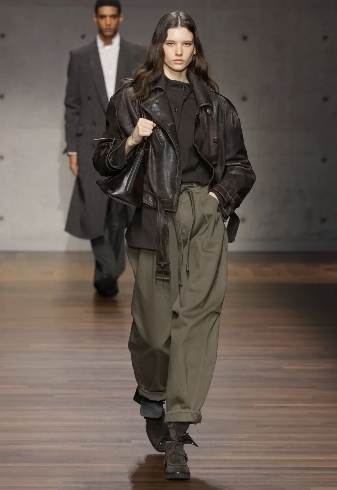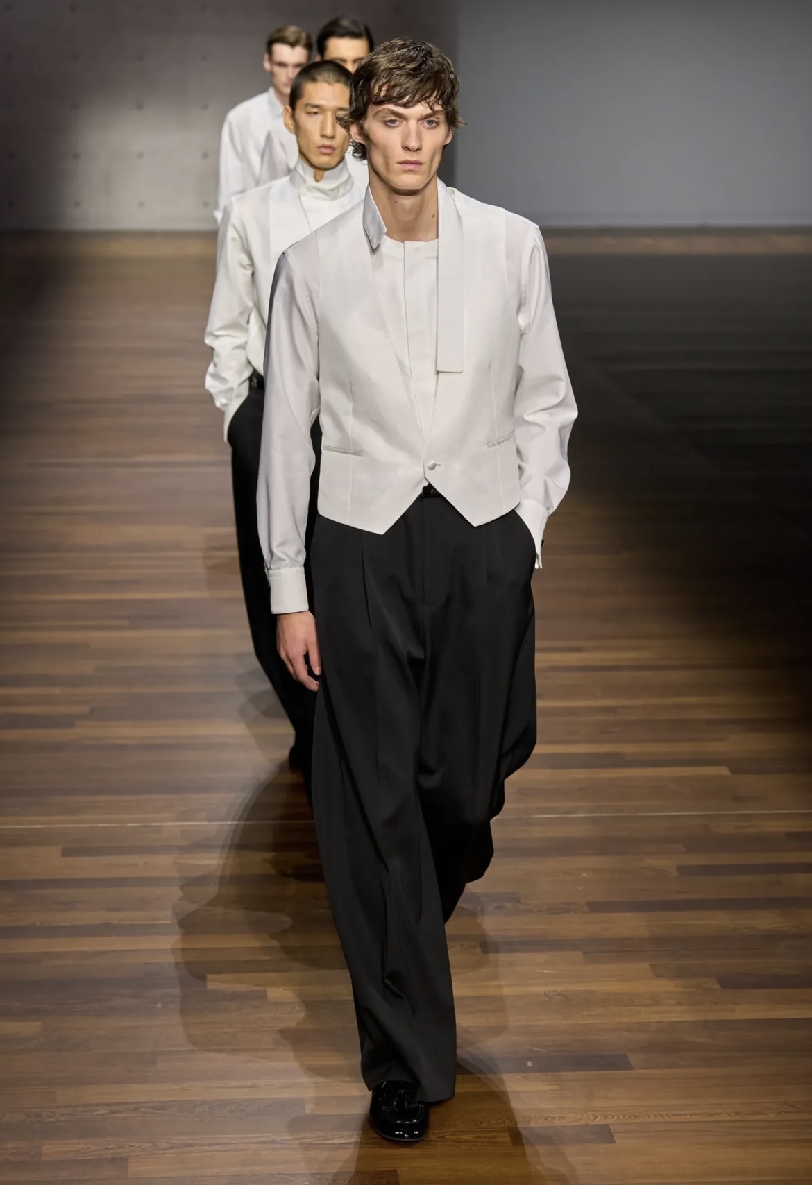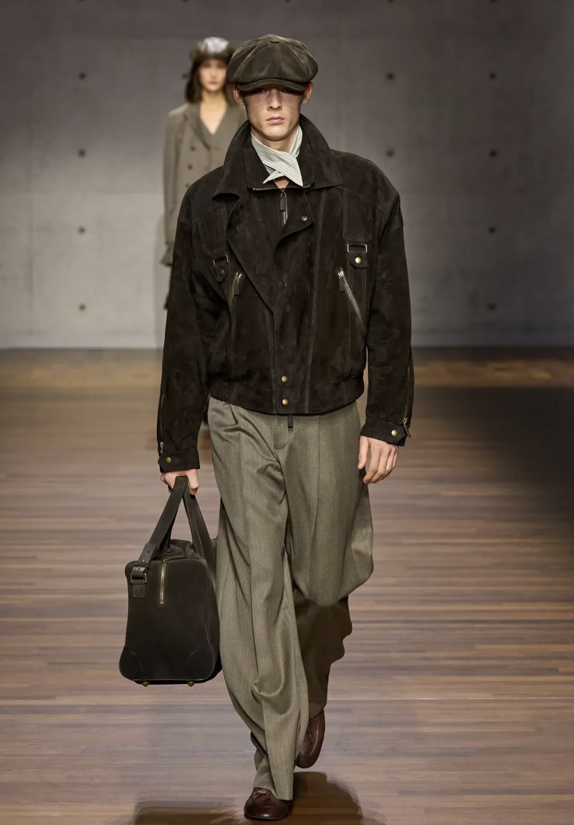 Nel menswear dominano completi dalle spalle marcate e pantaloni ampi, spesso abbinati a gilet, camicie fluide e cappotti lunghi. Spiccano anche giacche doppiopetto, capi in pelle, bomber e baschi, che rafforzano un’aria rétro calibrata. I tessuti oscillano tra lana, tweed e velluto, con proposte più leggere per la sera: completi scuri con dettagli satinati che aggiungono profondità senza eccessi. Nel womenswear il linguaggio rimane lo stesso: minigonne con calze lunghe, pantaloni morbidi, giacche strutturate e abiti dal taglio essenziale. Nei dettagli emergono luci discrete e ricami nei look evening, senza abbandonare la base sartoriale.