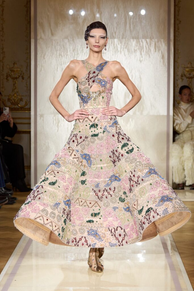 Questa sfilata non ha solo segnato i 20 anni del marchio nell’alta moda, ma si è anche eretta come un omaggio alla sofisticazione senza tempo e alla purezza del design. La passerella, situata in un maestoso edificio in pietra intagliata del Grand Empire, è stata trasformata in un palcoscenico da sogno, con un’atmosfera eterea che evocava l’eleganza dei primi del Novecento. Un perfetto equilibrio tra modernità e nostalgia, dove l’Art Deco si è fuso con una femminilità contemporanea, dando vita a una proposta visivamente straordinaria e carica di storia.