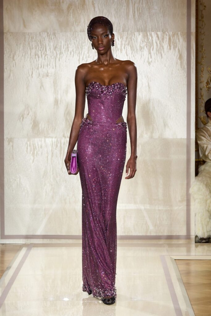 Uno dei momenti più sorprendenti della passerella è arrivato con l’apparizione degli abiti da sera, che si sono distinti per la loro caduta impeccabile e il dominio assoluto del drappeggio da parte di Armani. Gli abiti in tonalità metalliche e malva, con tagli asimmetrici e trasparenze strategiche, emanavano un’eleganza che evocava le grandi stelle del cinema classico di Hollywood. Il gran finale della sfilata è stato un abito da gala assolutamente stupefacente: un vestito con gonna voluminosa, adornato con ricami minuziosi e cristalli incastonati meticulosamente, che ha concluso la passerella in modo magistrale. Questo momento non solo ha rappresentato la maestria tecnica della maison italiana, ma anche la sua visione dell’alta moda come arte in continua evoluzione, che continua a tracciare la strada nell’industria.