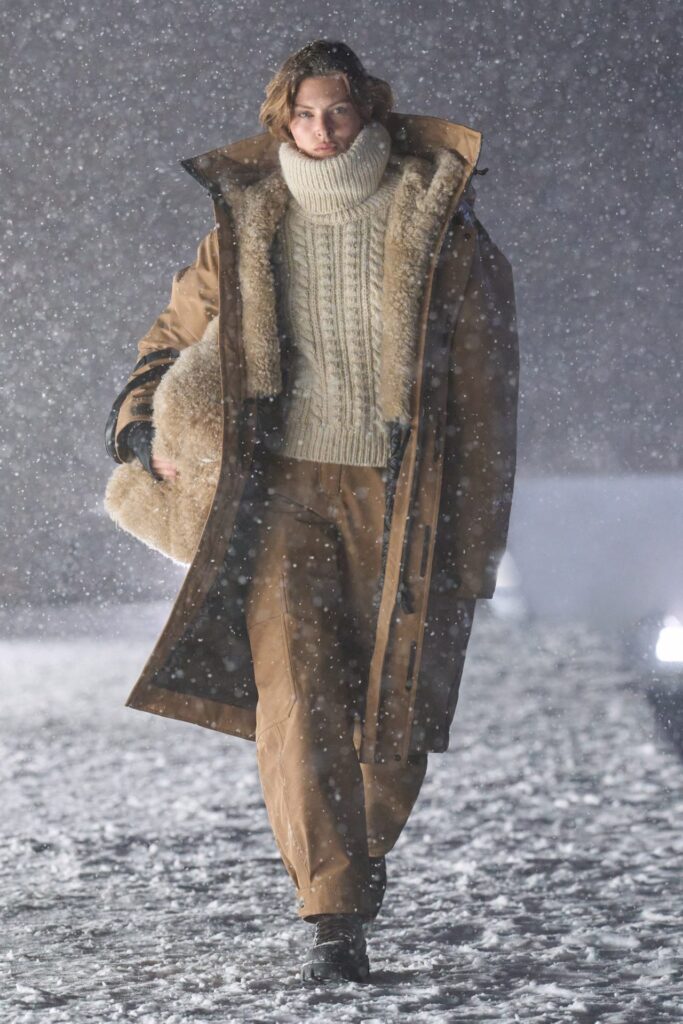 L’atmosfera era magica. Gli ospiti — tra cui Anne Hathaway, Adrien Brody e Jessica Chastain — sono arrivati avvolti in mantelle nordiche bianche personalizzate, confondendosi con il paesaggio innevato. Sotto un arco laser di 15 metri e una luce eterea, le modelle sono apparse su buggies da neve prima di sfilare su una passerella ghiacciata. La collezione, composta da 140 look, si è ispirata alla dualità tra funzione tecnica ed espressione individuale. La direzione creativa, fedele alle radici alpine del brand, ha esplorato come l’estetica urbana possa salire in quota senza perdere identità.