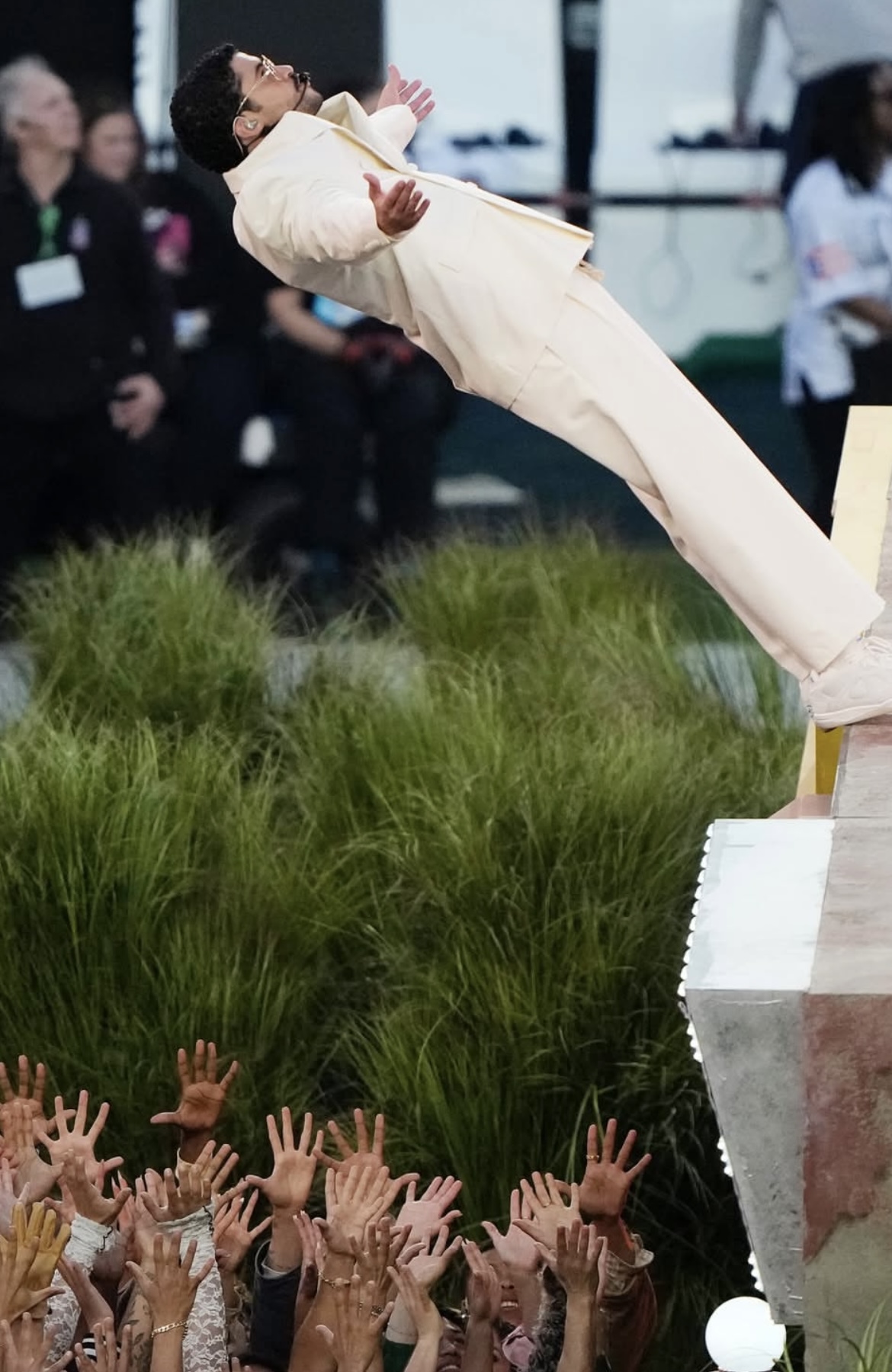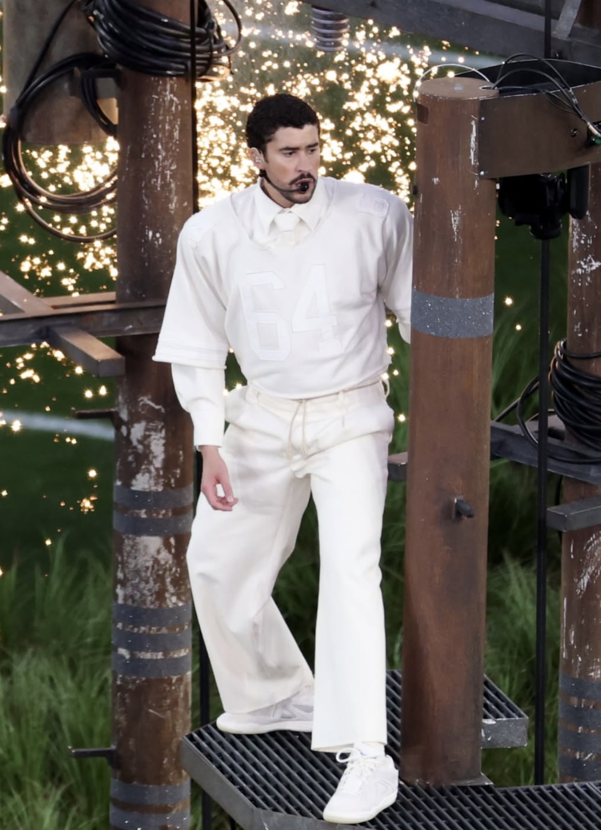 Il cantante è apparso con una proposta monocromatica nei toni crema: camicia, cravatta e pantaloni, completati da una maglia sportiva personalizzata con il cognome Ocasio e il numero 64. Lo styling, firmato da Storm Pablo e Marvin Douglas Linares, è stato arricchito da guanti e dalle sue sneaker BadBo 1.0. In un secondo momento, l’aggiunta di un blazer ha elevato la silhouette verso una dimensione più formale, senza spezzare l’armonia dell’insieme. Il risultato è stato un equilibrio tra spettacolo di massa, eredità personale e sofisticazione contemporanea.