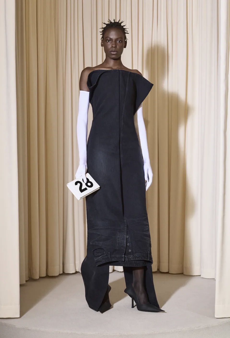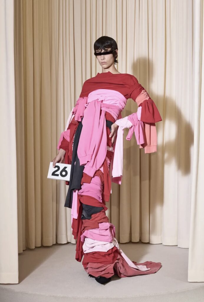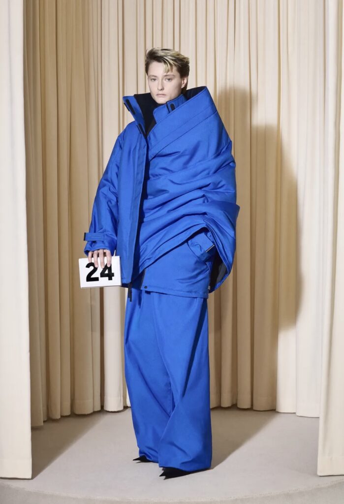 La sconsideratezza è un termine che incarna questa collezione, includendo silhouette esagerate e cappelli drammatici che più volte coprivano il volto delle modelle, così come ornamenti a forma di farfalla sui loro volti, grandi parrucche e specie di piattini rovesciati. Per quanto riguarda i tessuti, si è potuto apprezzare l’elevazione dei tessuti a un altro livello, passando da una collezione semplice a una straordinaria. Un esempio è uno dei look che integrava un cappotto di pelle blu lungo e peloso, realizzato con parrucca sintetica, o l’outfit finale, confezionato con 47 metri di materiale che solitamente si usa per foderare abiti da gala, il quale può essere usato solo una volta. I design presentati hanno fuso le origini delle tecniche distintive della casa con la provocazione e l’innovazione di Demna.