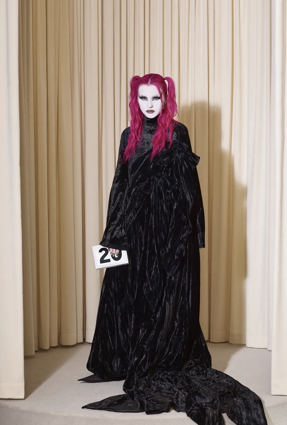 La sfilata è stata accompagnata da una meditazione guidata, in cui si parlava di come vivere una vita piena e sostenibile, sessione che non differisce in gran misura da quelle che il direttore creativo ascolta, menzionando che lo fa “per trovare una sorta di Bluetooth dentro di me che mi porti alla mia creatività”. Sono stati presentati principalmente 4 componenti: silhouette avvolgenti, cappelli ostentati e innovativi, maniche a tre quarti e tessuti singolari. Questi elementi sono stati immersi nella particolarità dell’abbigliamento urbano sovversivo. Sotto il concetto di omaggiare i codici di abbigliamento della sottocultura e la sua grande influenza, come menziona il designer, si è avuto l’obiettivo di “creare un ponte tra l’eleganza e la silhouette caratteristica di Balenciaga e il mio stile personale”.