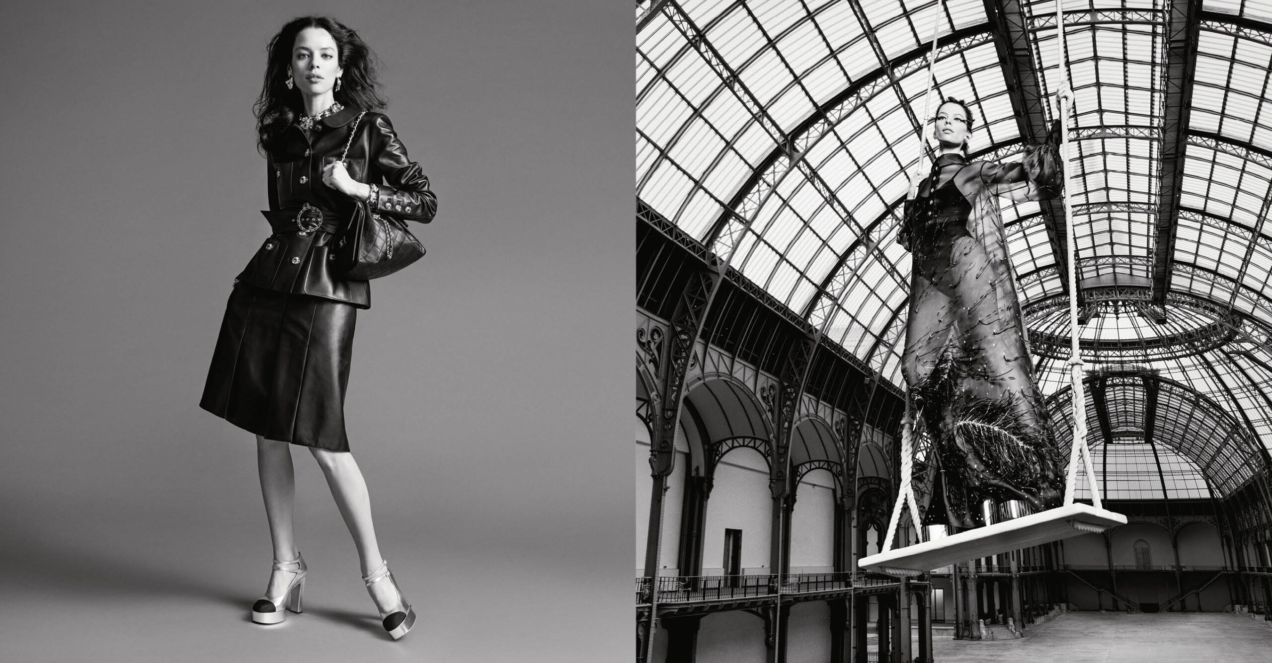 Per questa stagione, il tweed si fa interprete dell’architettura del Grand Palais. Le trame a quadri di un tailleur pantalone, abbinate all’iconica borsa 11.12, richiamano la maestosa cupola di vetro, mentre un abito nero con effetto cravatta e colletto bianco reinterpreta il tweed in chiave grafica. L’eleganza classica di CHANEL si sublima nei dettagli preziosi: una giacca bianca con una gonna avvolgente, impreziosita da bottoni gioiello, trecce decorative e un lungo nastro di chiffon nero, rappresenta la quintessenza della raffinatezza.
