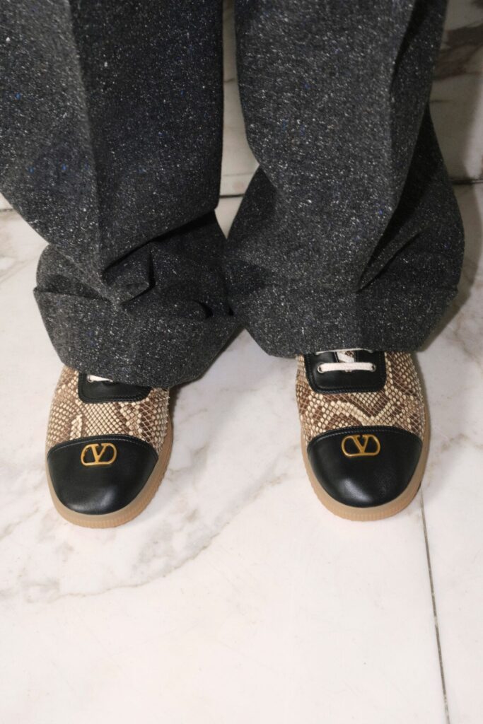 Gli accessori assumono un ruolo centrale all’interno della collezione. Michele li utilizza come uno spazio in cui concentrare l’identità senza appesantire il resto del look. Il Rockstud ritorna con alcune evoluzioni: più preciso, più affilato, con riferimenti a Roma e alla storia della maison. Le borse, in particolare la DeVain, compaiono in molteplici versioni, colori e dimensioni. Anche nel menswear emerge un approccio simile: completi più morbidi, tagli rilassati, tonalità sobrie e piccoli gesti inattesi che rompono la rigidità.