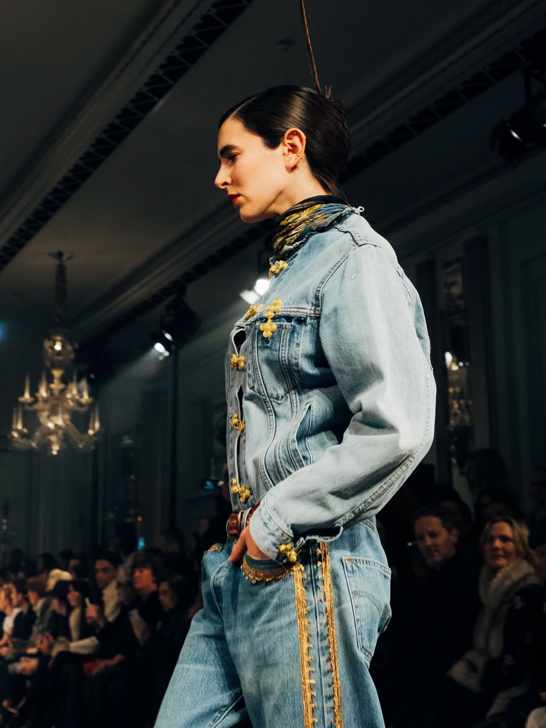 La collezione si distingue per la varietà tessile e per l’impiego di materiali riciclati, cifra caratteristica del designer. Denim, pelle, satin e seta riemergono sotto nuove forme, rafforzando un approccio sostenibile che non viene dichiarato come manifesto, ma si inserisce con naturalezza nel linguaggio estetico. La palette si muove tra neutri e tonalità terrose tipiche della stagione, interrotta da accenti più vibranti — giallo neon e viola — che creano contrasti e danno ritmo alla passerella.