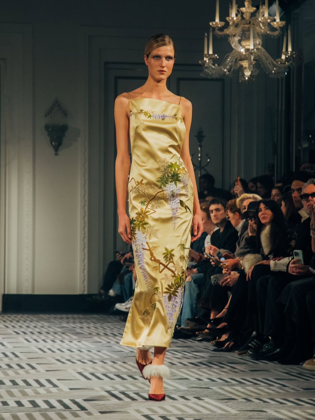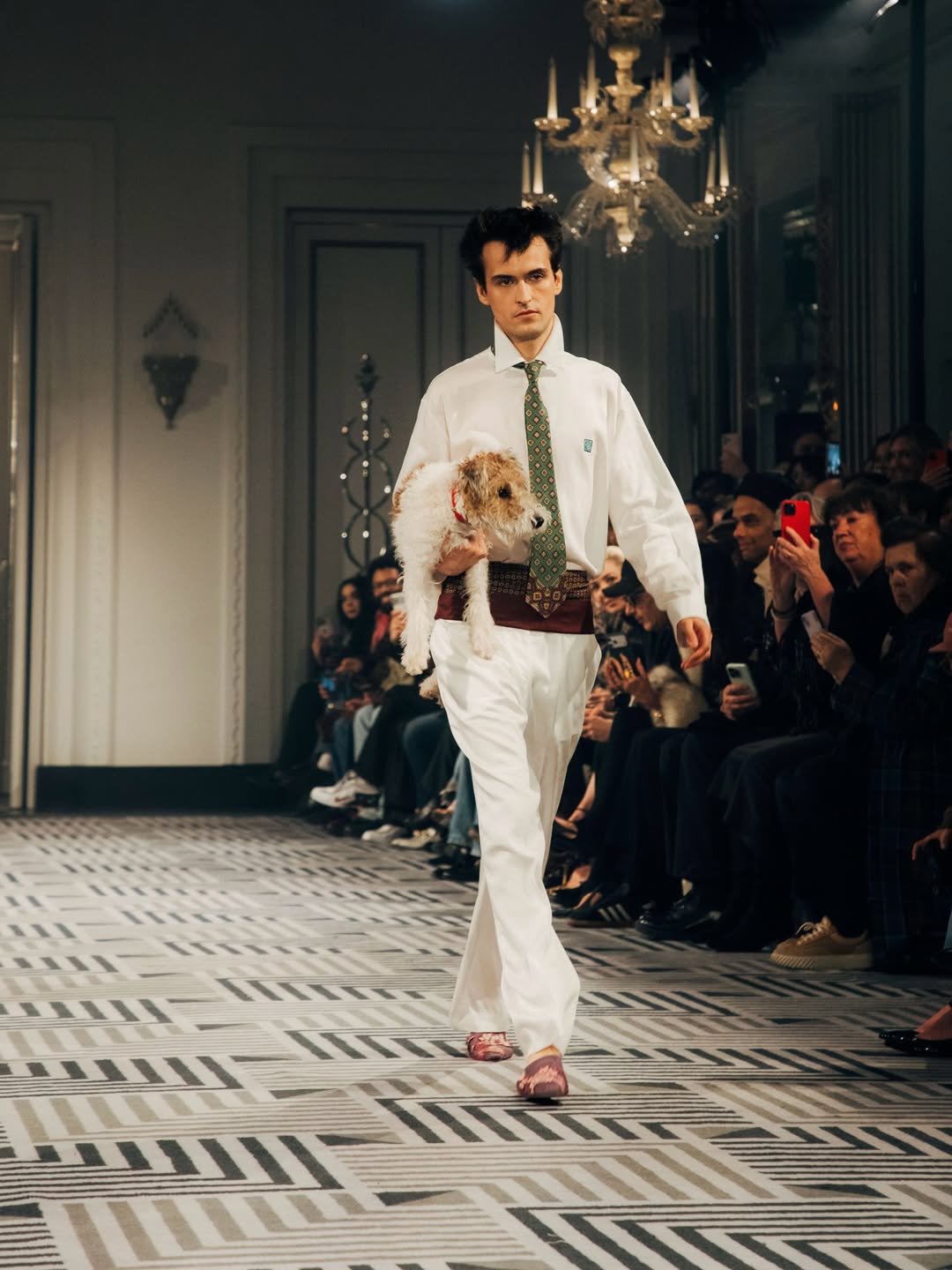Tra gli elementi più iconici spiccano i foulard. Plissettati al collo, trasformati in abiti lunghi e corti, oppure integrati in stratificazioni e drappeggi, diventano un motivo ricorrente che rafforza l’idea di memoria rielaborata. Più che accessorio, il foulard funziona come gesto stilistico capace di legare i look tra loro. Dettagli come ricami a mano, applicazioni e giochi di silhouette aggiungono carattere a ogni uscita, costruendo un dialogo interno tra i capi all’interno dello stesso insieme. In Eldorado, ogni pezzo sembra portare con sé una storia. Con questa collezione, Conner Ives ribadisce che la moda può essere reinterpretata e riutilizzata senza perdere identità: l’estetica del ricordo, nelle sue mani, non è nostalgia vuota, ma un modo per avanzare.