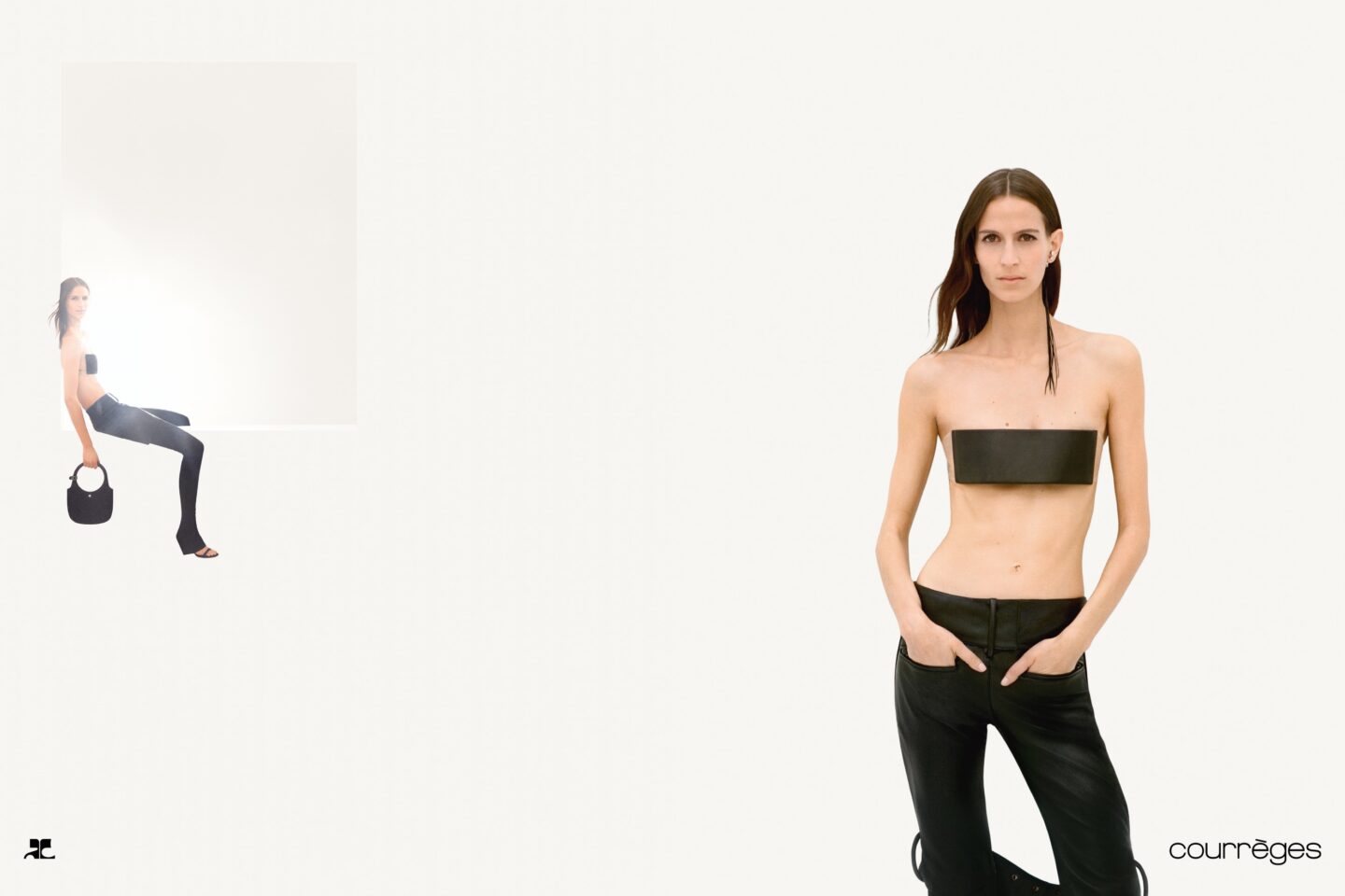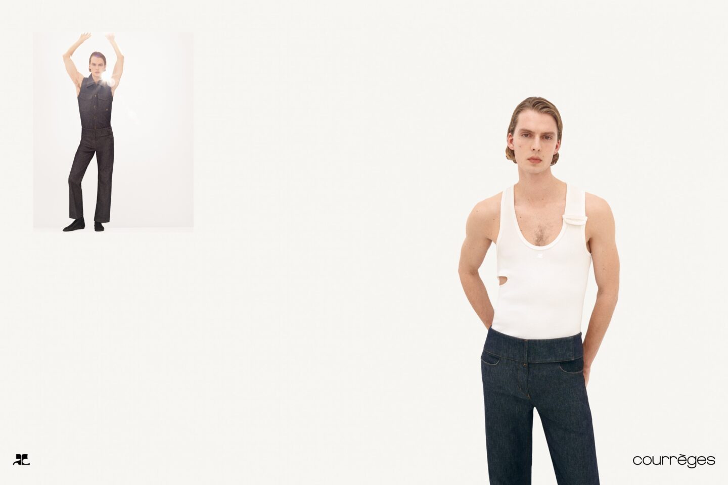 I modelli Jeanne Cadieu, Angelina Kendall, Sara Caballero, Leon Dame e Ibra Niakate incarnano l’attitudine sofisticata, elegante e disinvolta di Courrèges. La collezione presenta capi chiave come completi in denim strutturato, top Carré Magique, bluson in pelle e l’iconica Holy Bag.