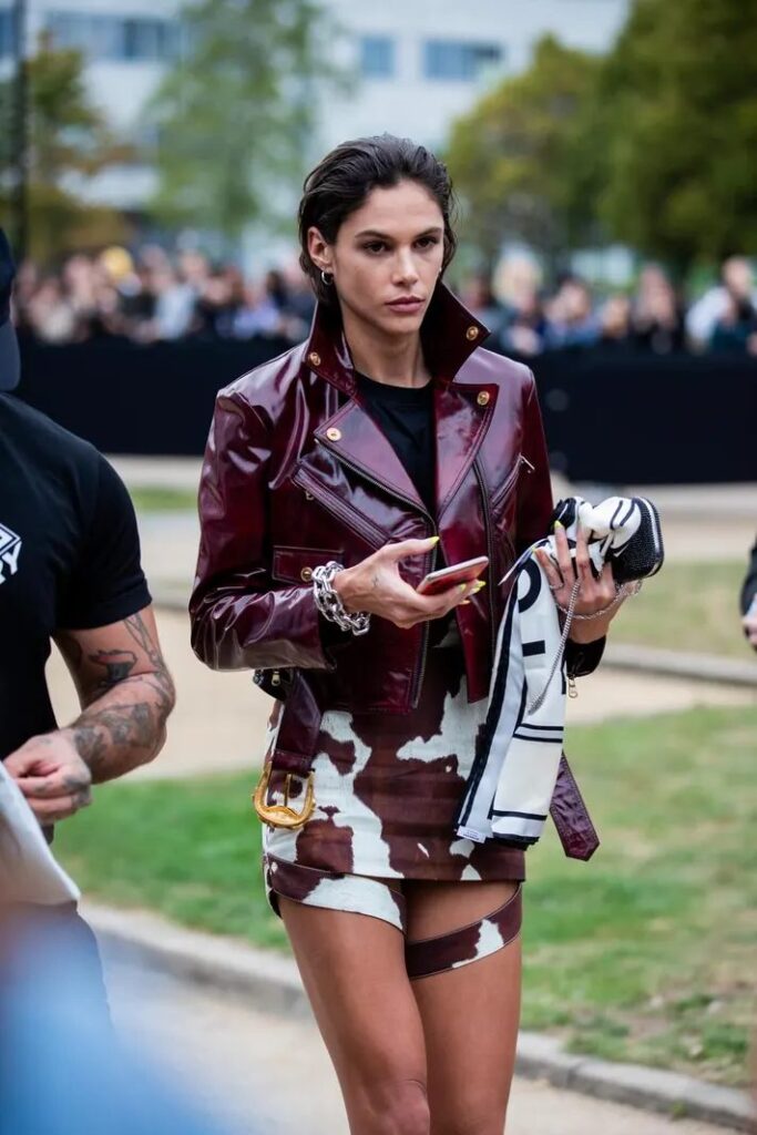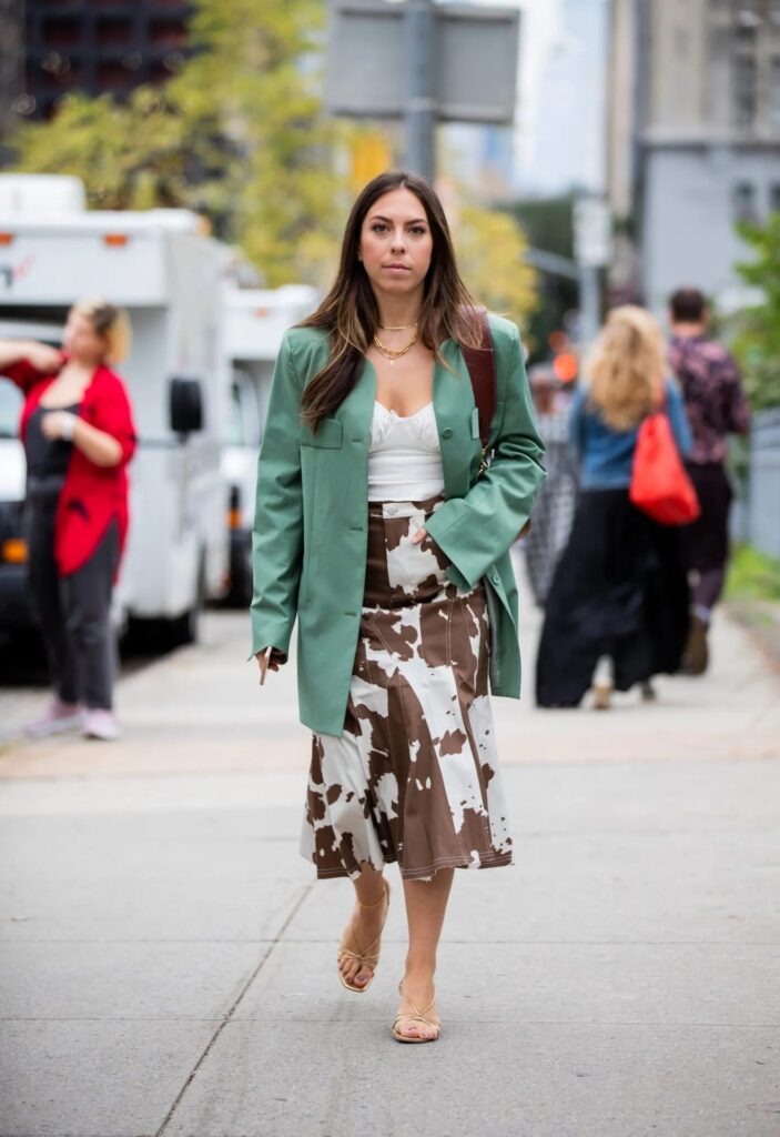 Il cow print non è del tutto nuovo. Ha avuto un momento di notorietà negli anni ’90, ma non ha mai raggiunto l’attuale livello di popolarità. Oggi spicca per la sua versatilità: può essere il protagonista assoluto in un outfit massimalista o aggiungere un tocco giocoso e moderno a look più minimalisti. Inoltre, si presenta in molteplici varianti: dalle classiche macchie in bianco e nero a versioni più audaci in marrone o colori vivaci. Il cow print trova spazio su una vasta gamma di capi e accessori: giacche, cappotti lunghi, stivali alti, borse e persino clogs.