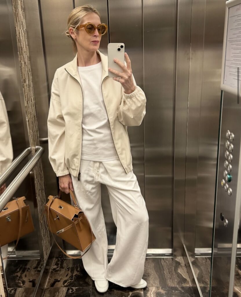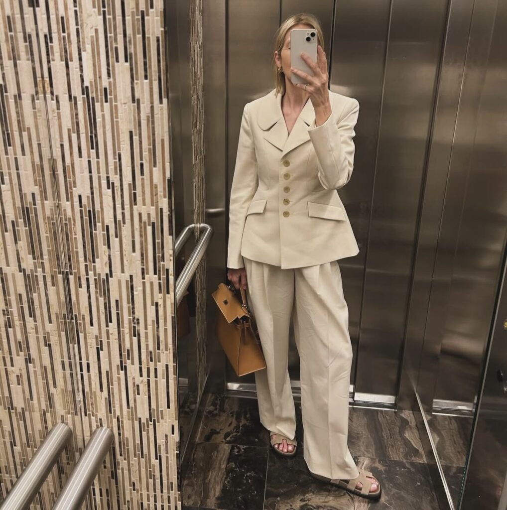 Il suo stile si muove su formule semplici ma infallibili: colori neutri o stampe leggere, silhouette pulite e combinazioni monocromatiche che elevano l’outfit senza mai esagerare. Rutherford predilige capi che sfidano il tempo — gilet ampi, trench classici, gonne satinate — e accessori ben studiati: borse tote firmate, occhiali da sole oversize, anelli dorati e scarpe chiave come ballerine, stivaletti e décolleté. Tutto appare perfettamente calibrato e autentico. Un’eleganza naturale che sembra sussurrare: “Questa sono io, senza sforzo, ma con intenzione”.