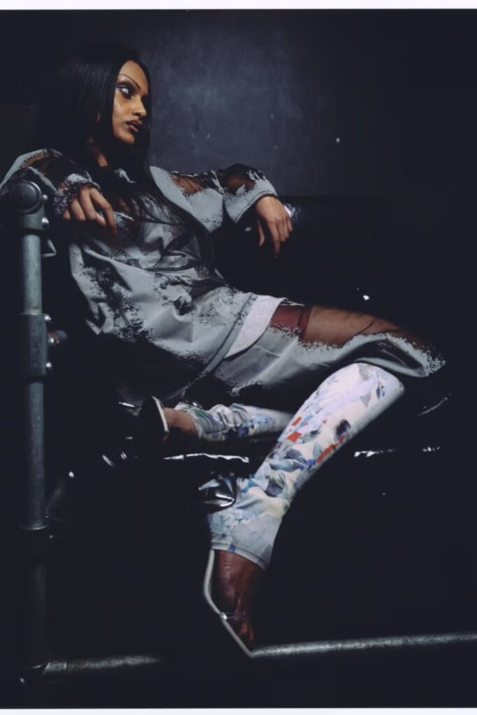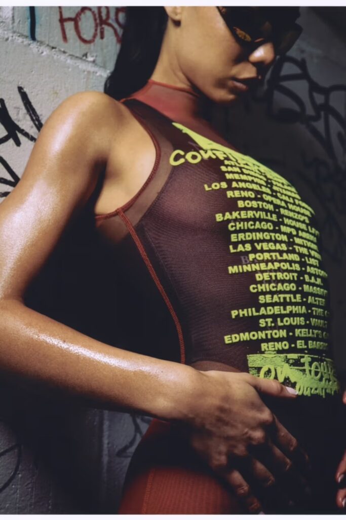 Parlando di design, la capsule è un viaggio nei primi anni Duemila con uno spirito raver e massimalista. Tra i must-have: abiti trasparenti con stampe ad aerografo e silhouette anatomiche, minigonne con biker shorts integrati in tessuto sheer, e T-shirt grafiche che richiamano i manifesti dei concerti. Il denim, firma inconfondibile di Diesel, ritorna con lavaggi consumati e grafiche che ricordano i tour musicali. Tra gli accessori, spicca il borsa Play in una nuova versione con motivi grafici, gli occhiali Trini-D-Y (in collaborazione con EssilorLuxottica) e le Lake Clear Mules: platform futuristiche che chiudono il look con un tocco visionario.