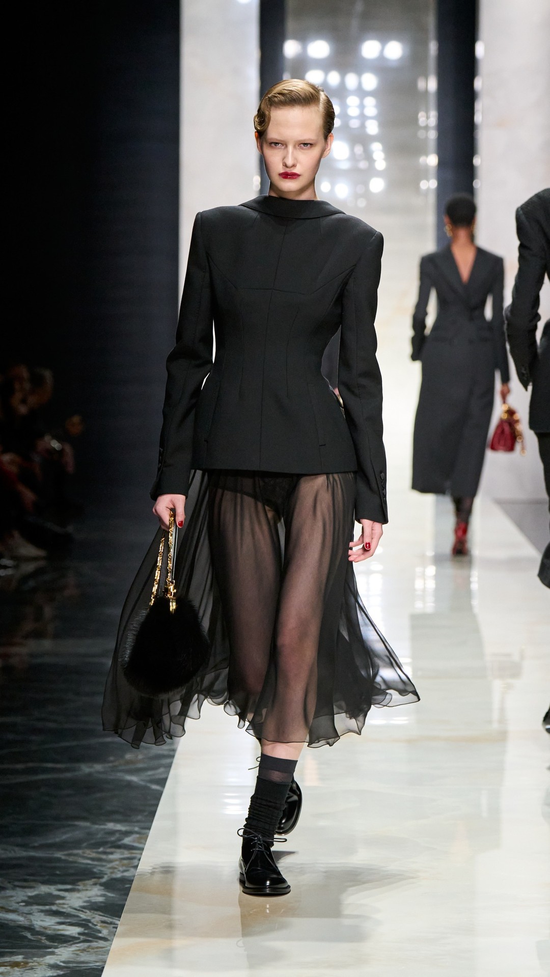 Uno show che affila i codici della maison fino a renderli taglienti: nero assoluto, pizzo come potere, sartoria come armatura, Sicilia come battito.