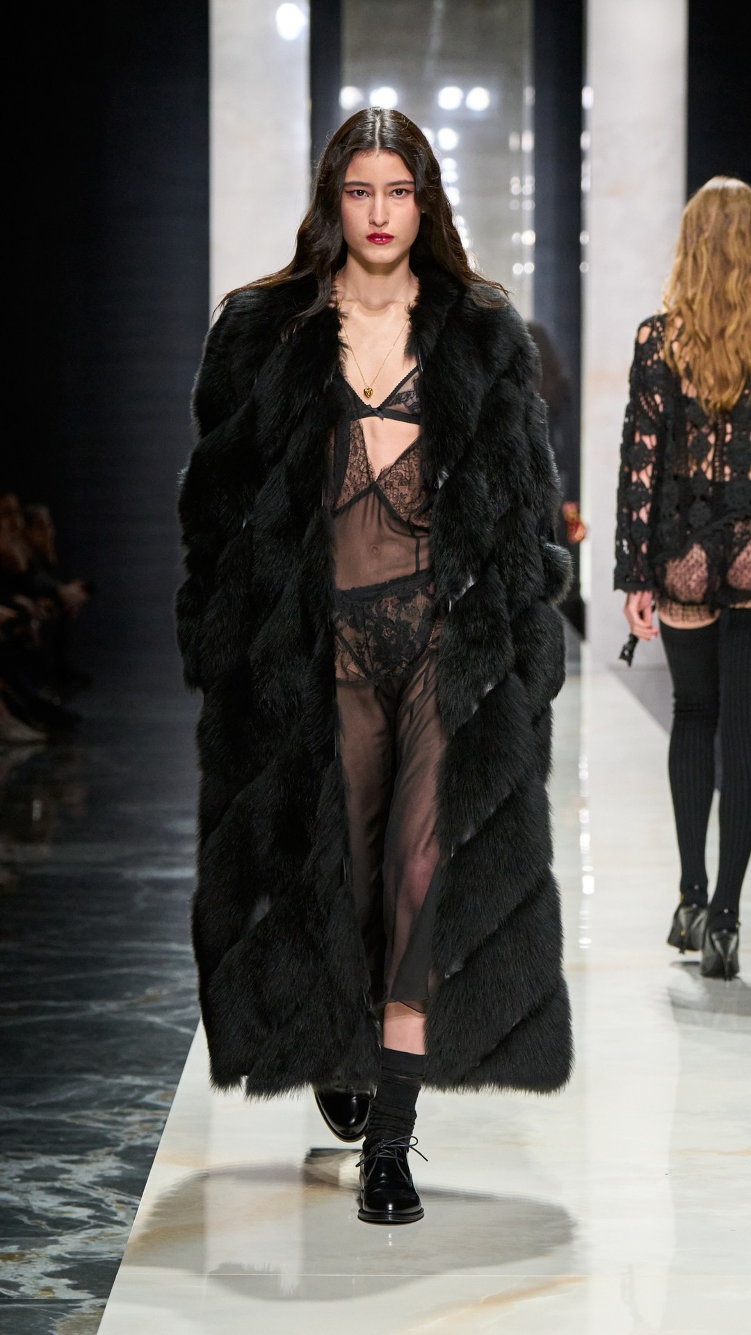 E dentro a questa apparente monocromia, la collezione apre un ventaglio tattile: trasparenze quasi sacrali, lucentezze minime, opacità dense, pizzi che non decorano — comandano — e materiali che lavorano la luce come se la pelle fosse parte dello styling.