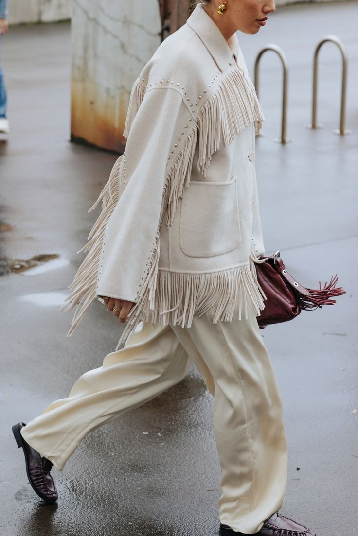 Nelle sue molteplici versioni, le frange sono apparse su diverse passerelle nel 2026: più spesse o delicate, in materiali, forme e colori differenti. Una tendenza che non si limita a un solo capo, ma si espande in varie direzioni, dialogando con altre correnti della stagione. Anche lo street style e i brand più popolari si uniscono a questo movimento: inizialmente le abbiamo viste su stivali di ispirazione cowboy, in tonalità terrose, per poi estendersi verso giacche di stili differenti.