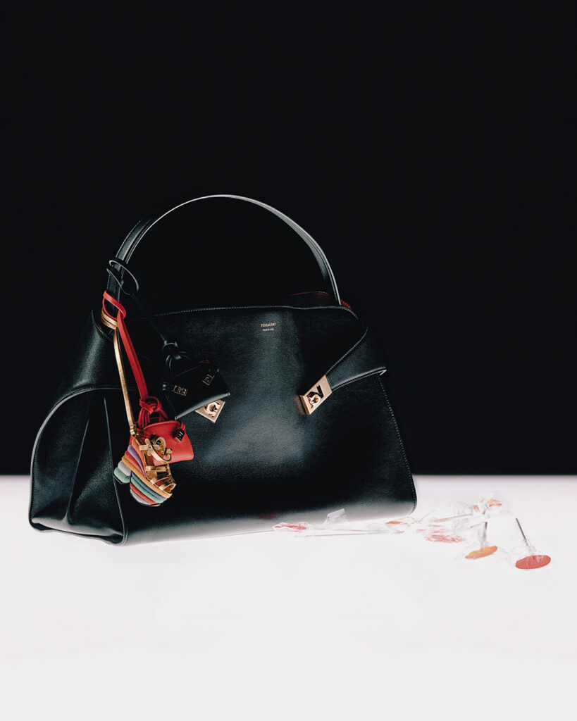 Tra i protagonisti di questa stagione, i pezzi simbolo di Ferragamo: i pump adorati da Marilyn Monroe, le vivaci sandali rosse e le emblematiche Hug Bag, create con maestria dagli artigiani italiani e impreziosite da dettagli che aggiungono un tocco di meraviglia.