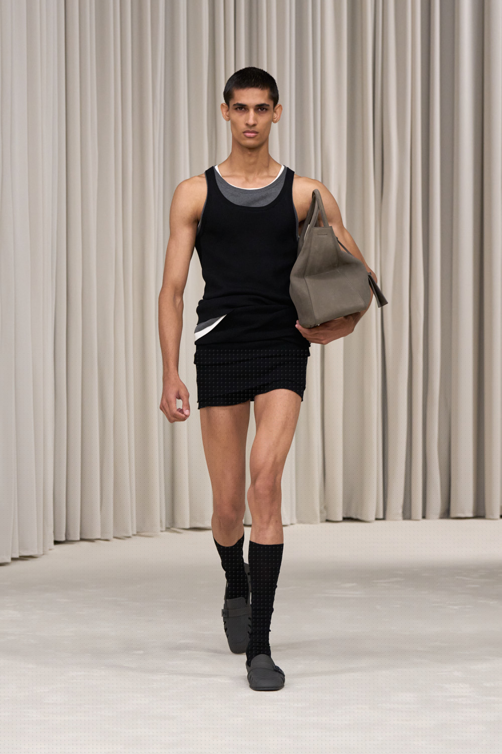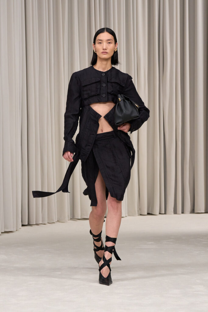 Nel calzature, gli stili a punta della scarpa Eva e un sandalo grafico si adattano al polpaccio con nastri in seta opaca, rievocando la storia delle ballerine della collezione in un minimalismo moderno. Altrove, compaiono mule in jacquard con frange accanto a stivaletti geometrici, un’evoluzione contemporanea di uno stile d’archivio degli anni ’40.