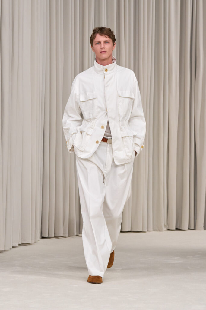 La collezione sembra anche permeata dall’energia caraibica: denim usurato e stonewashed; forme organiche; mocassini in gomma. Le finiture grezze contrastano con la purezza della collezione; gli orli rialzati iniettano romanticismo con un tocco di feticismo.