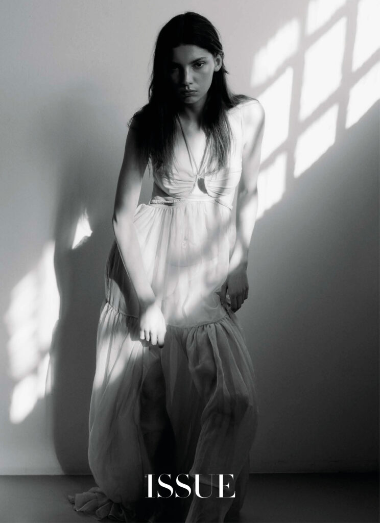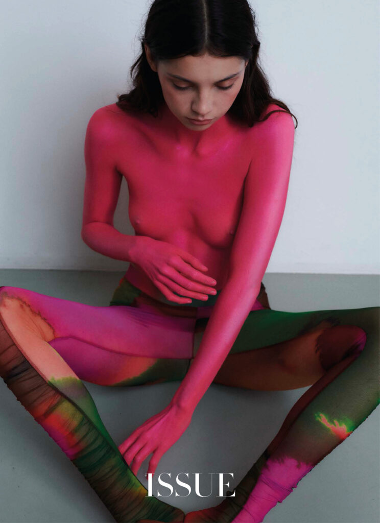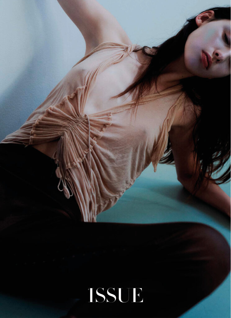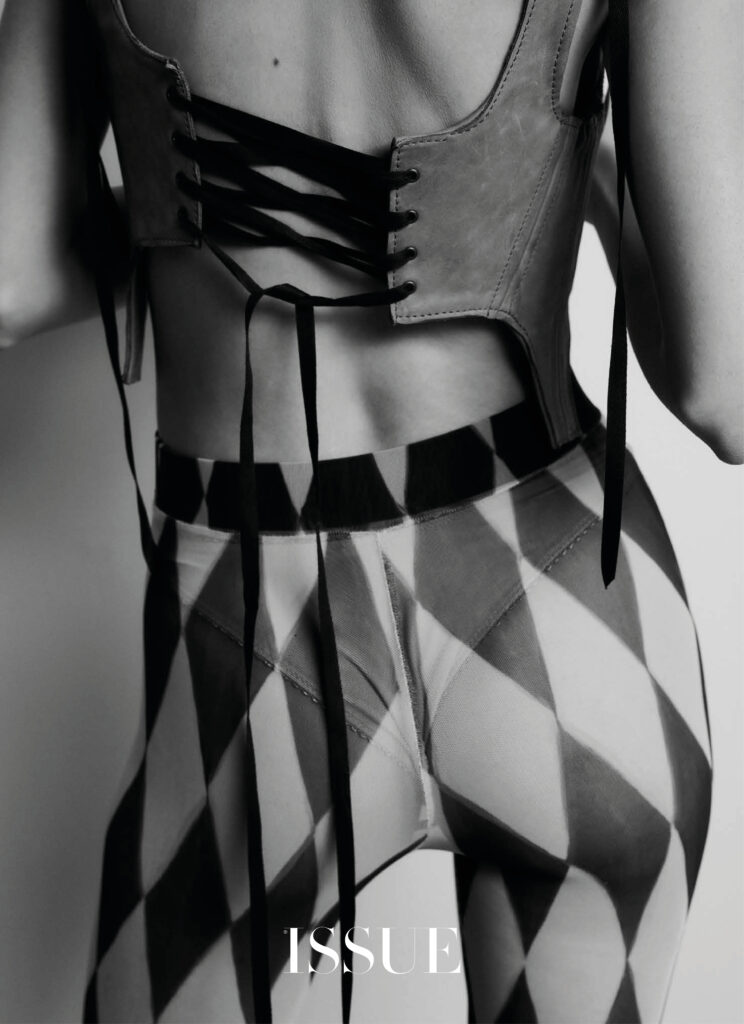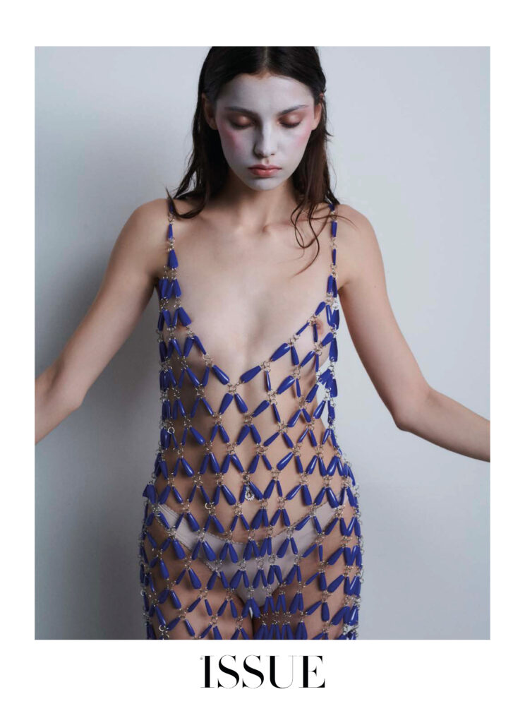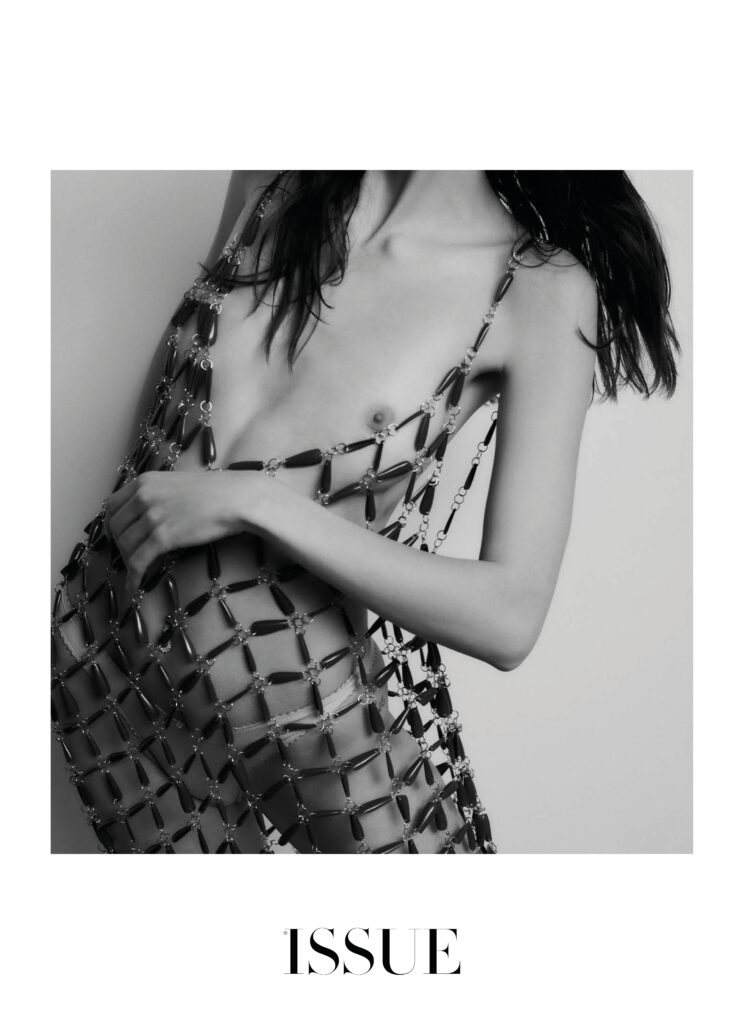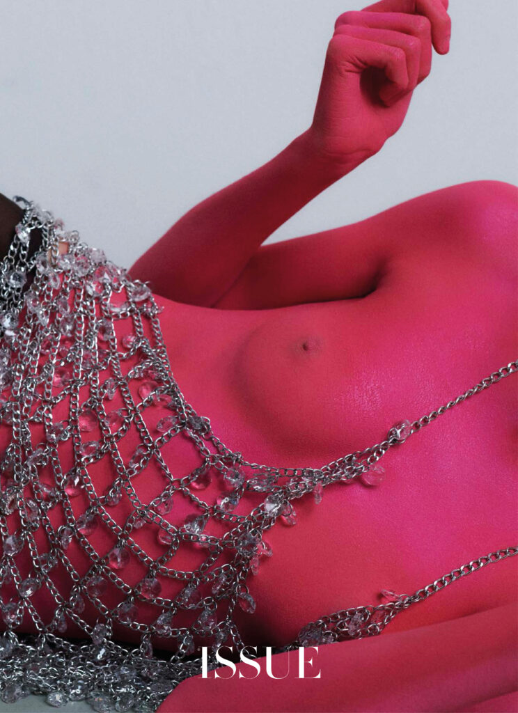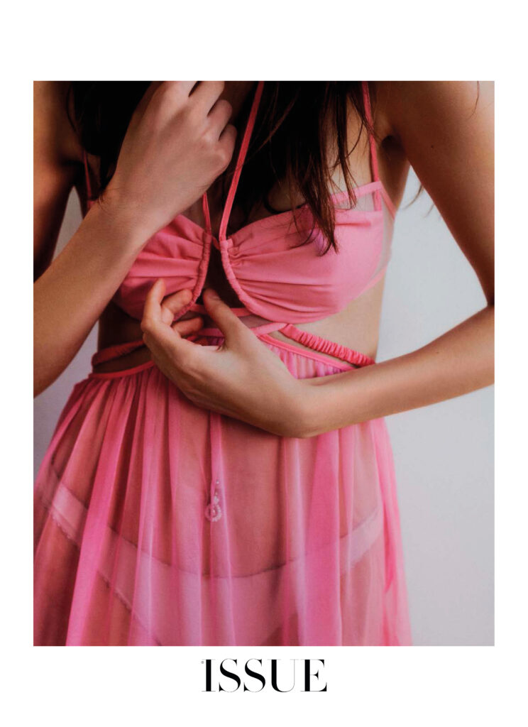 La vita, la bellezza… Il tempo si frammenta e la nostalgia irrompe con tracce del passato. Immagini che iniziano a svanire e flashback che ci portano in un’altra epoca o luogo. Forse a un’emozione o alla leggerezza di quella gonna Prada che, abbinata a un crop top coordinato, si sentiva come un abito romantico e fluido. O magari a quel momento in cui il tuo corpo fu coperto di pittura rosa e hai esplorato la moda come nessuno. Con calze multicolori, un top fatto di catene e cristalli o un vestito con ciondoli blu, sempre con catene e la tua pelle esposta. Guanti da opera in chiffon con rombi e pantaloni dello stesso tessuto. Un gioco temporale, frammentato dal mistero e dalla sensualità che risiede nell’ingenuità.