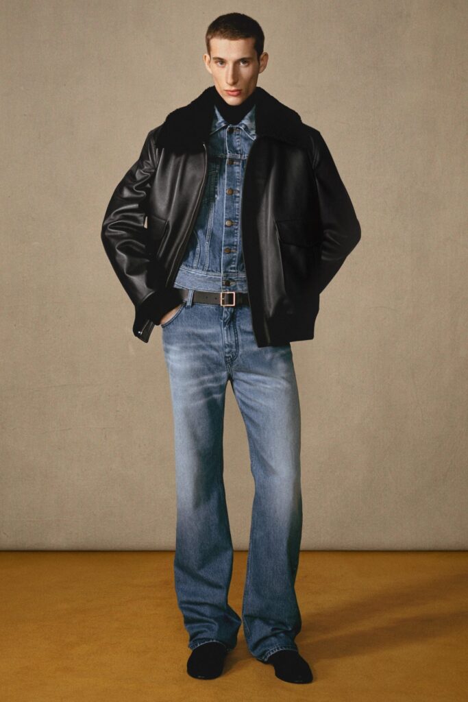 Esteticamente, la collezione menswear Autunno 2025 evoca un’influenza nostalgica degli anni ’70, ma con un twist contemporaneo che la rende attuale e innovativa. I completi sartoriali dal taglio preciso e le linee ben definite richiamano l’estetica delle rockstar vintage—uno stile che si potrebbe immaginare addosso a un artista come Wesley Schultz dei The Lumineers, spesso immortalato con una giacca doppiopetto in un profondo tono bordeaux, perfettamente in linea con questa collezione. I pantaloni lunghi e leggermente svasati aggiungono fluidità e movimento, bilanciando la struttura della sartoria con un comfort rilassato. L’uso della pelliccia di visone riciclata sottolinea ulteriormente il richiamo rétro della collezione, rispondendo alla crescente domanda di pellicce vere in modo più consapevole e sostenibile. Questa collezione non è solo un insieme di capi, ma una dichiarazione di intenti su come la moda possa raccontare storie—di stile, di etica e di trasformazione nel modo in cui percepiamo e viviamo l’abbigliamento. Ancora una volta, Gabriela Hearst dimostra che il futuro della moda maschile può essere tanto audace quanto consapevole, tanto sofisticato quanto sostenibile.