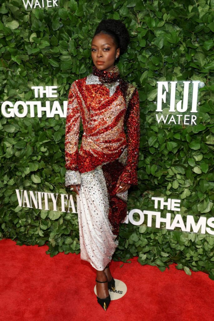 Infine, Danielle Deadwyler ha chiuso la serata con un look mozzafiato: un abito ricamato con migliaia di cristalli in tonalità vibranti di rosso, arancione e pesca, con strati asimmetrici, un capolavoro della collezione Resort 2025 di Alexander McQueen.