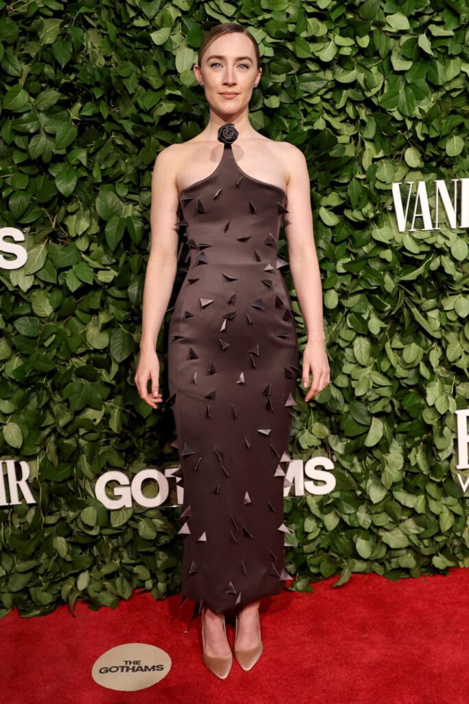 Saoirse Ronan, celebre per i suoi ruoli in Piccole Donne e Amabili Resti, ha impressionato con un abito in satin marrone di Schiaparelli Haute Couture della collezione Autunno 2024, decorato con una rosa sullo scollo e dettagli tridimensionali geometrici.