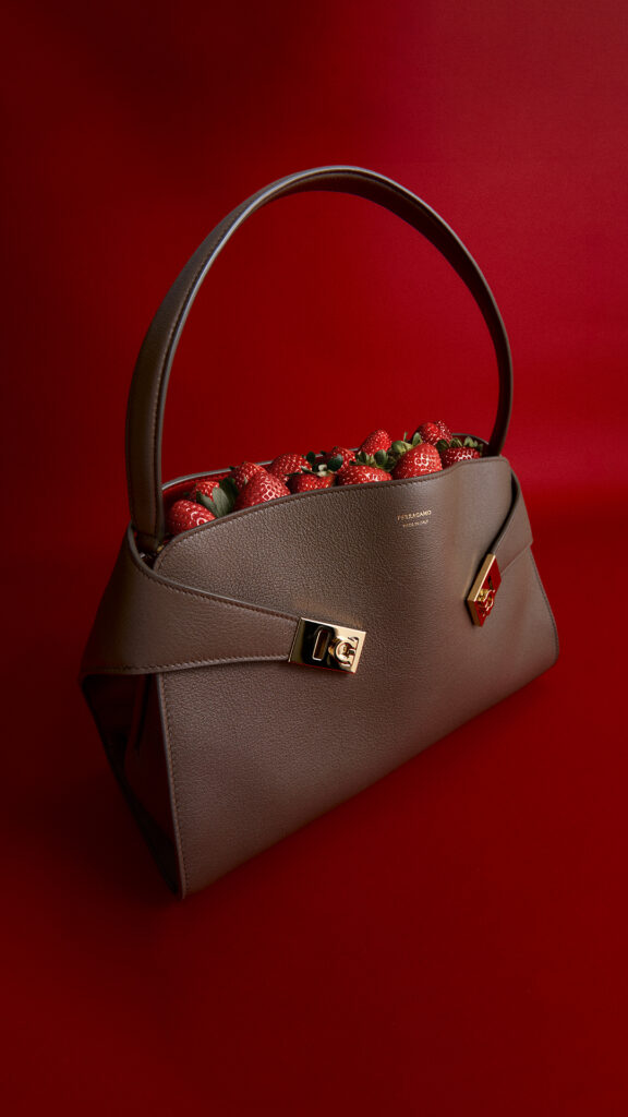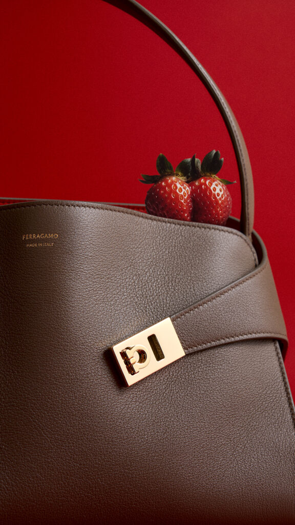 Ferragamo celebra San Valentino con “I See Hugs Everywhere”, una campagna dedicata all’iconica borsa Hug. Le immagini evocative raccontano il simbolo dell’abbraccio attraverso scatti ricchi di passione, con la borsa Hug protagonista su sfondi intensi in rosso e nero, accompagnata da frutta rossa e fiori che simboleggiano l’unione di due parti essenziali.