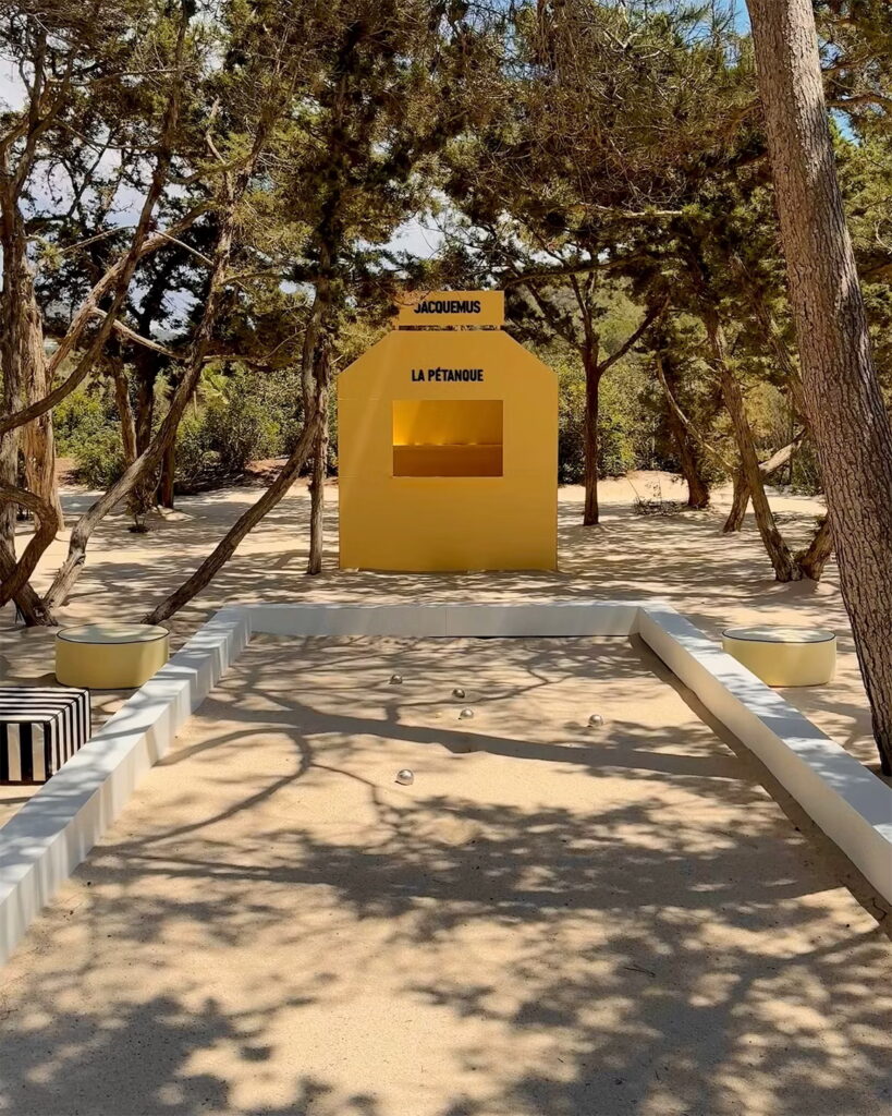 Il beach club è stato completamente rivisitato secondo l’universo estetico di Jacquemus: ombrelloni, lettini, cuscini e persino un campo da pétanque si tingono di giallo vibrante e pois a contrasto, creando uno scenario perfetto per foto, storie e momenti da condividere. Non è solo un luogo per fare shopping, ma una vera immersione nella filosofia del brand: gioiosa, mediterranea e piena di dettagli inaspettati.