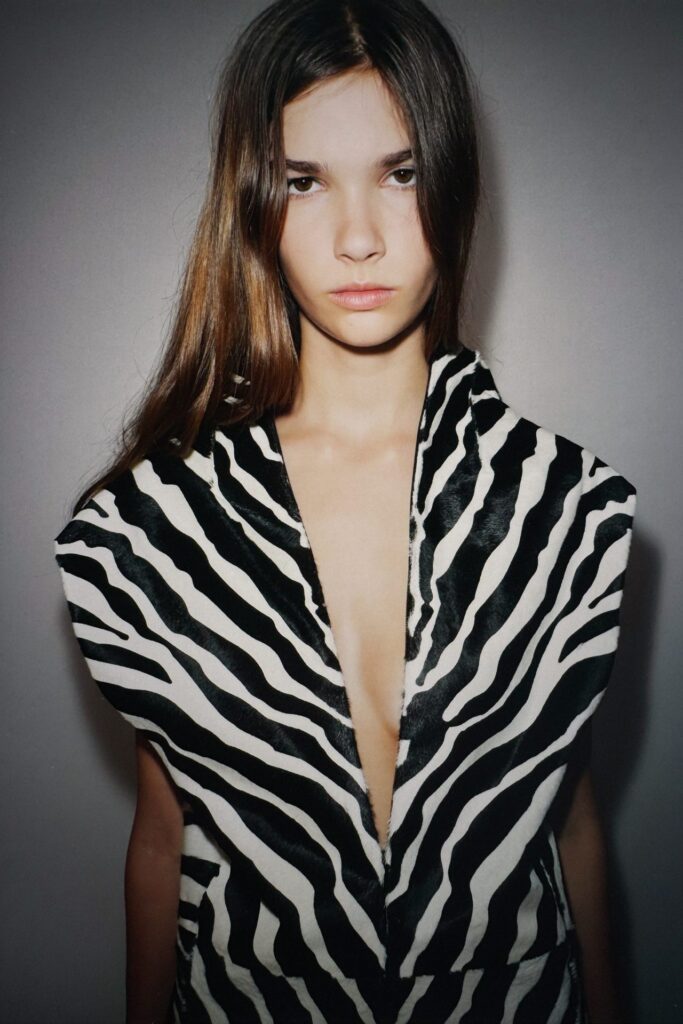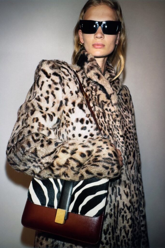 L’ispirazione è chiara: gli anni ’90, ma senza nostalgia. Holstein rilegge quel decennio in cui il bohémien incontrava il grunge, filtrandolo attraverso una visione contemporanea. Il risultato? Camicie oversize stampate a fiori, abiti trasparenti con pinces delicate, giacche in pelle plongé che invitano al tatto. I materiali sono centrali: pony zebrato, organze di seta dai toni accesi, shearling double-face. E se il minimalismo rimane la base, qui c’è spazio per la sorpresa: stivali turchesi in struzzo, tote bag in pony viola, mocassini con tacco… e persino tasche sulle dita.