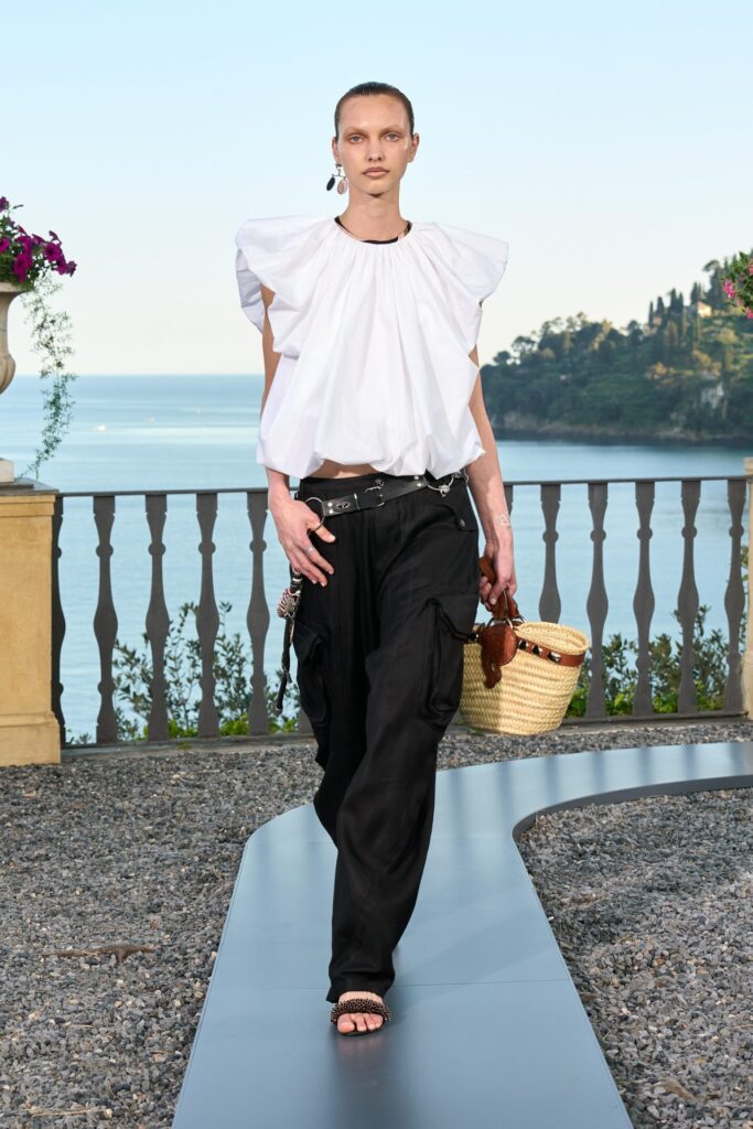 Camille Miceli, maestra nell’arte di fondere l’eleganza francese con la sensualità italiana, ha condotto l’heritage di Pucci verso una nuova dimensione. Protagonista assoluto è l’iconica stampa Marmo, una rilettura contemporanea del disegno nato dopo che Emilio Pucci rimase incantato dai riflessi cangianti della Grotta Azzurra di Capri. Sotto lo sguardo di Miceli, il motivo si trasforma: diventa tridimensionale, si incastona in ricami di pietre preziose su tuniche leggere e pantaloni palazzo, oppure si fa essenziale in versione bianco e nero, con bagliori madreperlati che ricordano le conchiglie.