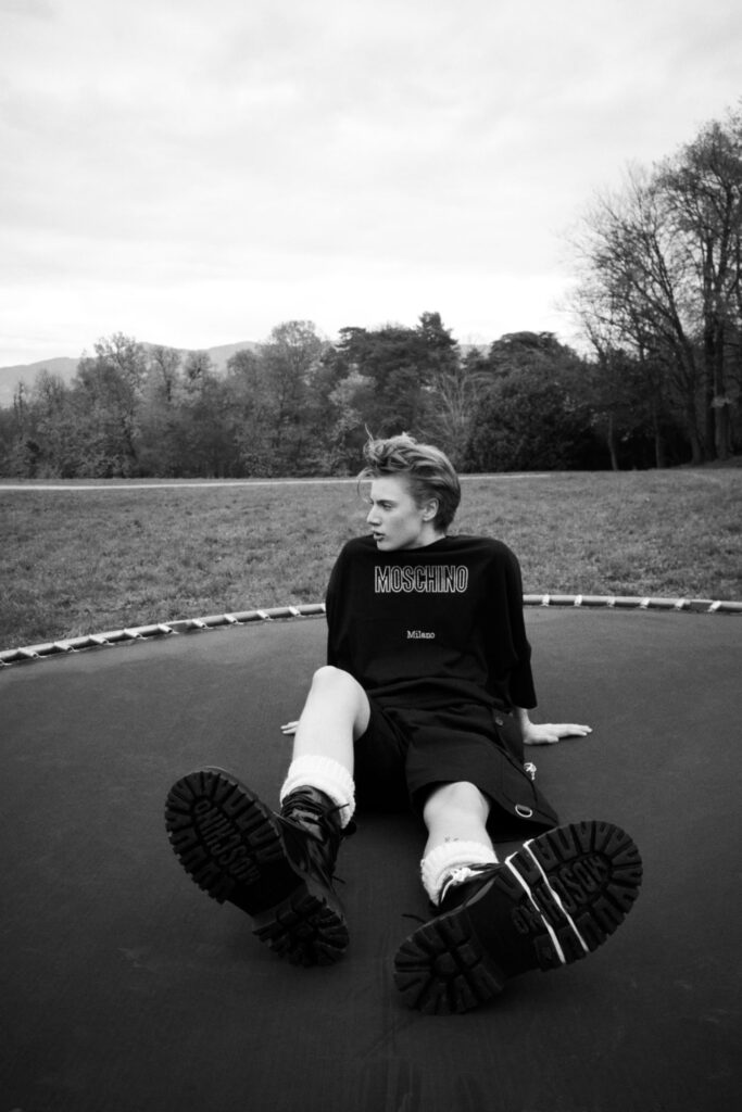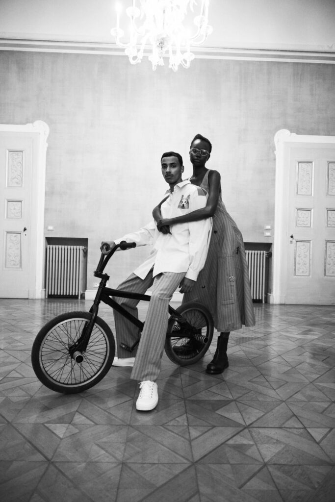 La presentazione della collezione si è svolta in una villa nei pressi di Milano, immortalata dal fotografo Chris Rhodes. Le immagini mostrano modelli in situazioni giocose: mentre pedalano in bicicletta nell’atrio, si travestono con tappeti antichi e usano il servizio da tè di famiglia come gioielli. Queste scene riflettono l’intento di Appiolaza di radicare la collezione nella quotidianità, senza perdere il tocco ironico e capriccioso che caratterizza Moschino.
