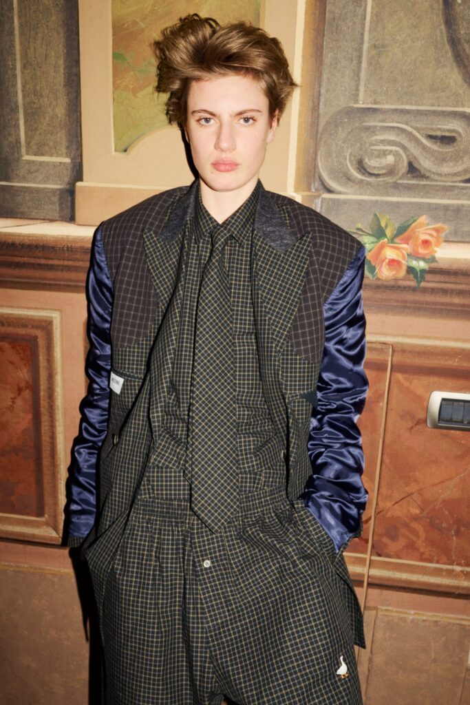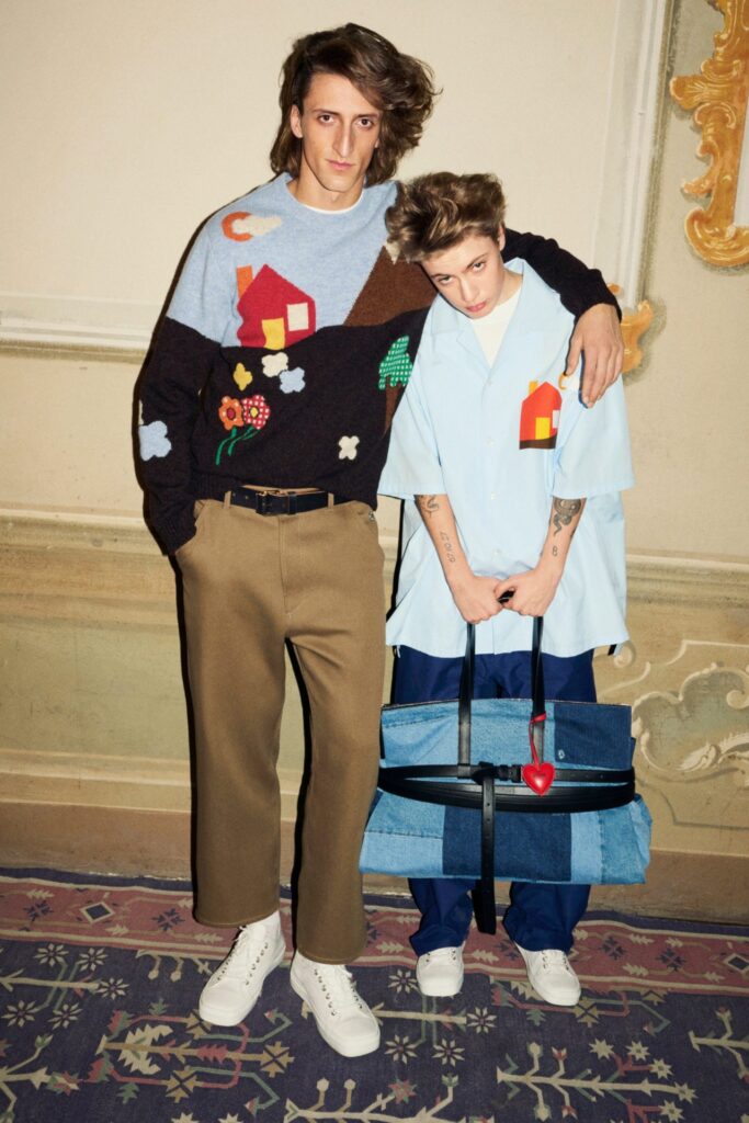 Tra i pezzi più notevoli spiccano t-shirt con stampe trompe-l’œil che riproducono giacche da caccia inglese, giacche assemblate che diventano abiti senza maniche e combinazioni di lingerie e camicie con motivi di tè e dolci. Inoltre, i classici maglioni a rombi vengono reinventati con faccine sorridenti e cuori, simboli che Appiolaza ha adottato come emblemi del marchio. Collaborazioni con aziende come Sanderson portano motivi floreali su abiti e completi, mentre disegni di nuvole e paesaggi, recuperati dagli archivi di Franco Moschino, aggiungono un tocco nostalgico alla collezione.