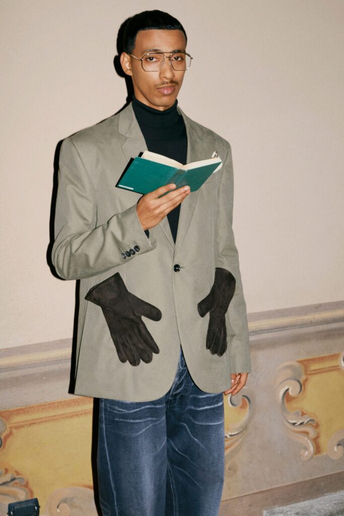 La personalità giocosa di Appiolaza si manifesta negli accessori, come una borsa con una stampa di nuvole e la frase “aiutami” scarabocchiata sopra, un’ironia che il designer descrive come un appello per diventare la prossima it-bag. Questa collezione segna un’evoluzione nella visione di Moschino, equilibrando l’eccentricità con la funzionalità e mantenendo viva l’essenza umoristica e sovversiva della maison.