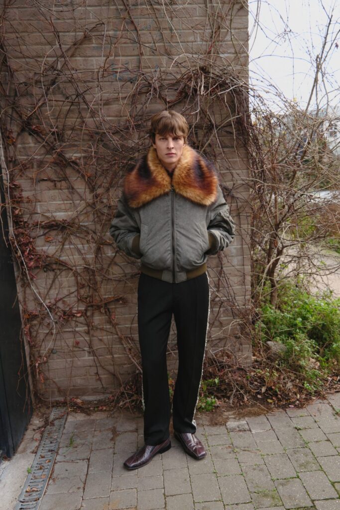 David Koma, noto per il suo approccio alla moda femminile, ha presentato la sua seconda collezione maschile per l’autunno 2025, consolidando la sua visione nel panorama della moda uomo. Ispirato dai passanti dell’East London, Koma introduce capi che fondono raffinatezza e funzionalità urbana. Spiccano i trench oversize e le giacche bomber in pelle tagliate, arricchite da colli in peluche color castagna, abbinate a pantaloni da tuta dal taglio ampio e mocassini, riflettendo un’eleganza rilassata.