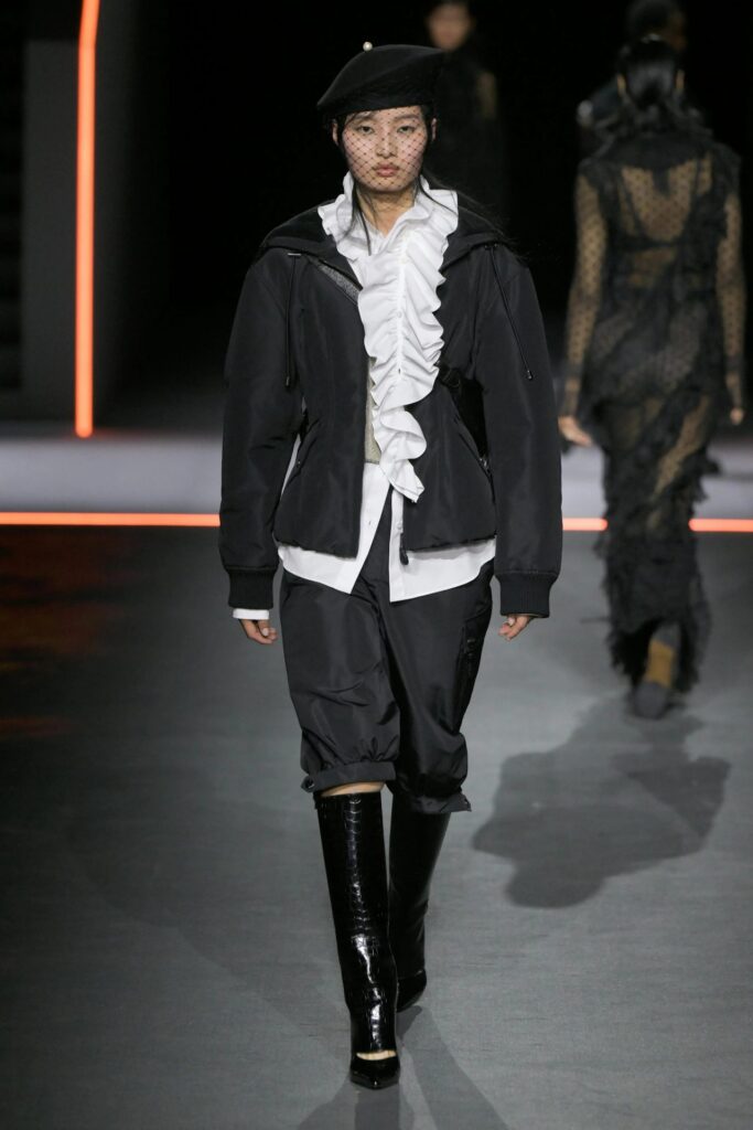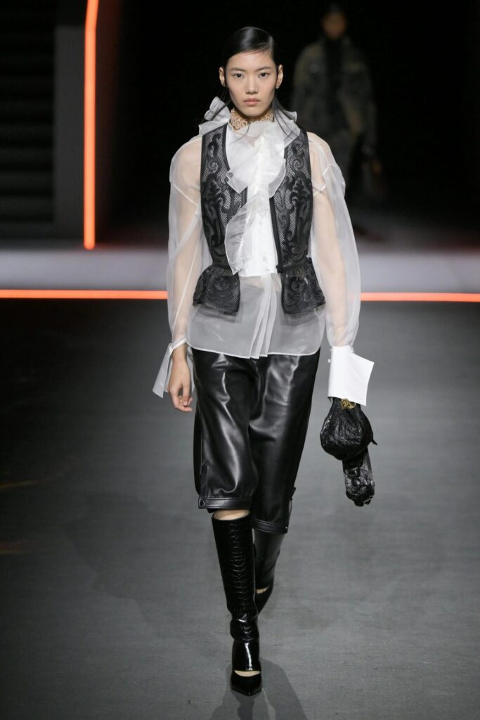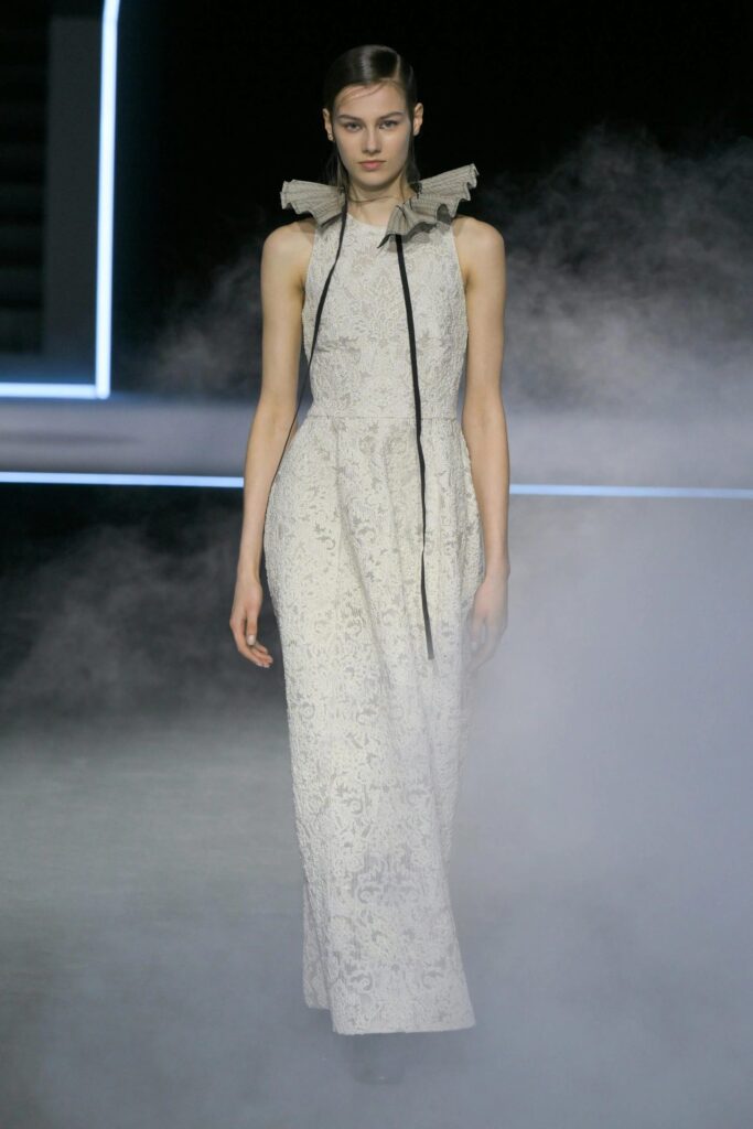 L’ispirazione di Maria Grazia Chiuri affonda le radici in Orlando, il celebre romanzo di Virginia Woolf, esplorando i confini tra maschile e femminile. Seguendo la fluidità di genere che caratterizza l’opera, la designer ha reinterpretato la moda femminile attraverso elementi tradizionalmente legati alla sartoria maschile. Così, camicie con jabot, casacche strutturate e abiti in pizzo e velluto si sono mescolati a scarpe dal taglio maschile come brogues e oxford, creando un equilibrio tra forza e delicatezza.