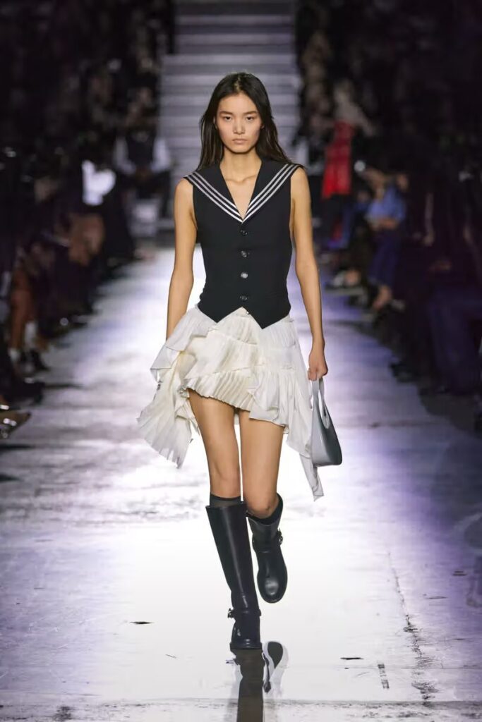 I capi della collezione esplorano l’equilibrio tra la struttura e la fluidità dell’universo videoludico. Giacche dalle spalle marcate si abbinano a pantaloni cargo in pelle e camoscio, mentre completi in lana dai toni ispirati alla fantascienza contrastano con tute aderenti in jersey verde neon e giallo elettrico. L’estetica preppy-punk prende il centro della scena con jeans a vita bassa usurati, gonne scozzesi e giacche da motociclista, un chiaro riferimento allo spirito del nuovo millennio. L’influenza del gaming si manifesta in parka asimmetrici ispirati a SSX, fasce che ricordano Lara Croft e stivali strutturati in stile Resident Evil, pezzi che trasmettono empowerment femminile e un’attitudine provocatoria. Nell’insieme, la collezione si presenta come una dichiarazione di audacia e innovazione, dove l’estetica si fonde con un’identità forte e riconoscibile.