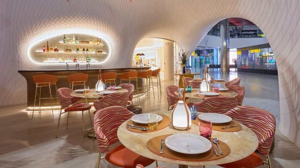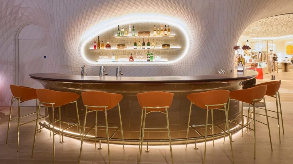 Dal momento in cui i visitatori entrano nel caffè, il design futuristico di Marc Fornes li avvolge in un’atmosfera che richiama lo spirito avventuroso di Louis Vuitton. Fornes, rinomato per i suoi progetti architettonici che uniscono arte e tecnologia, ha creato uno spazio che incarna modernità ed eleganza. La decorazione, caratterizzata da linee pulite e una struttura avvolgente, riflette il senso del viaggio e la raffinatezza tipica della maison, trasformando l’attesa di un volo in un’esperienza unica.