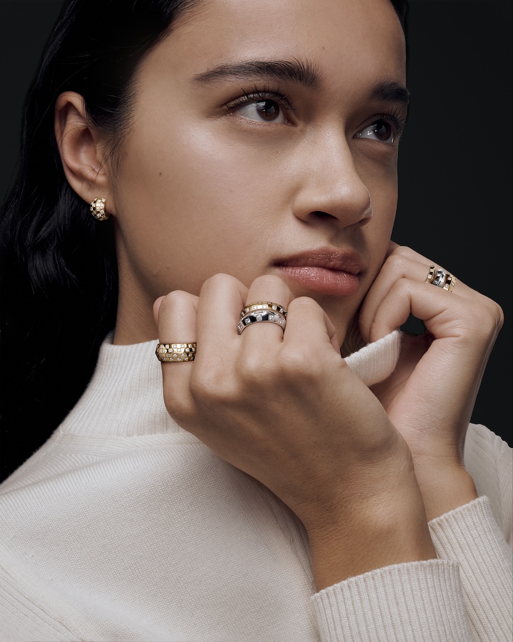 Composta da 12 squisite creazioni, tra cui anelli, bracciali tennis e orecchini a cerchio, Le Damier si distingue per il suo minimalismo dettagliato. Ogni gioiello è realizzato in oro bianco o giallo, con diamanti che diventano parte integrante del design, non solo semplici decorazioni. Il nuovo bracciale tennis, ad esempio, trae ispirazione da una partita degli US Open del 1978, interrotta affinché Chris Evert potesse recuperare i diamanti caduti dal suo bracciale. “Ho pensato al classico bracciale tennis, sempre in movimento e sempre al polso”, ha spiegato Francesca in un comunicato stampa. Le linee rette e i quadrati che richiamano il celebre motivo Damier si adattano con fluidità al corpo, facendo sentire ogni pezzo come un’estensione naturale di chi lo indossa.