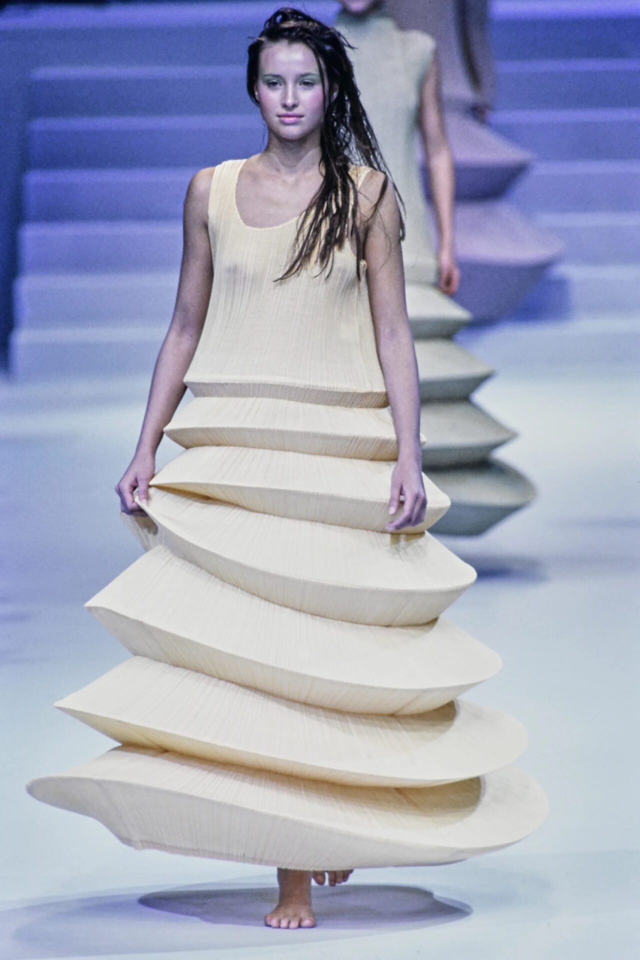 All’inizio degli anni ’70 prese una decisione cruciale: tornare in Giappone. Nel 1970 fondò il Miyake Design Studio, preludio di quella che sarebbe diventata una rivoluzione silenziosa ma radicale. La sua visione era lontana dalla rigidità della couture parigina. Per Miyake, un abito non era completo finché non veniva indossato: diceva di realizzare l’80% del lavoro, lasciando il restante 20% alla persona che avrebbe dato vita al capo. Iniziò a sperimentare con materiali inattesi — metallo, plastica, carta giapponese — tanto interessato all’aspetto del tessuto quanto al suo comportamento: come cade, come reagisce al movimento, cosa può diventare grazie alla tecnologia. Questa fusione di tradizione nipponica e sperimentazione lo posizionò, insieme a Rei Kawakubo e Yohji Yamamoto, tra le voci che portarono l’avanguardia giapponese al centro della moda globale.