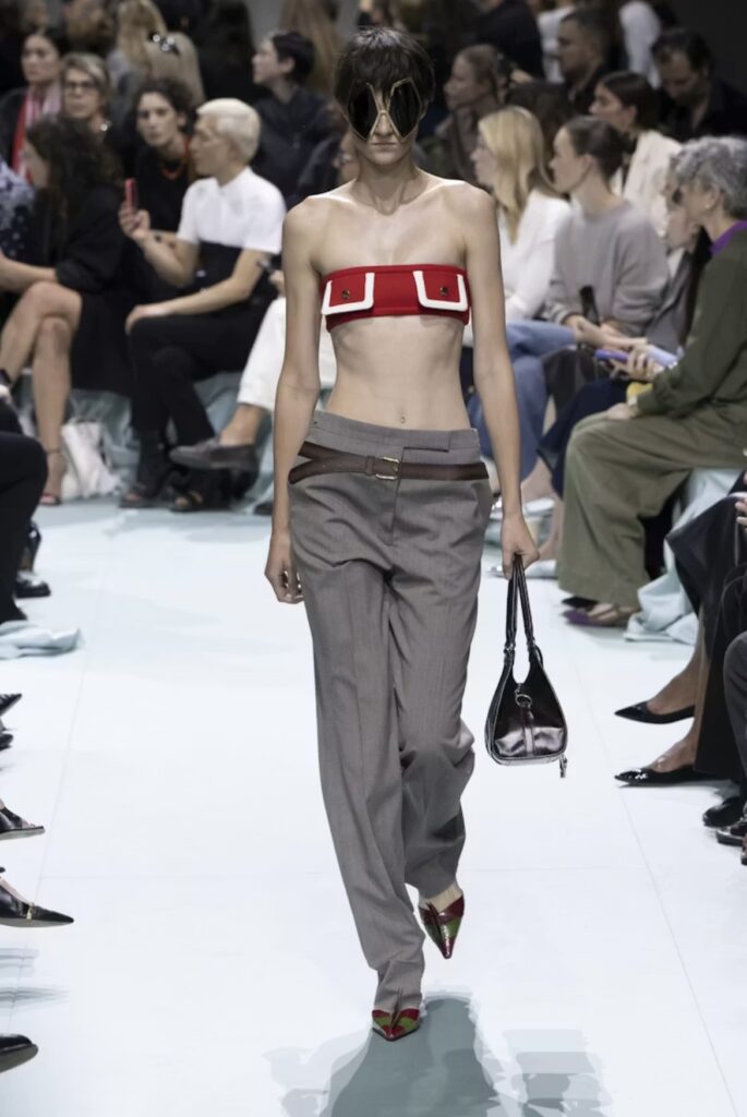 In questa tendenza, ogni capo ha un ruolo preciso. Le bralette tornano come top principali: strutturate, con stecche a vista e tagli che scolpiscono il busto, abbinate a pantaloni dritti o gonne lunghe a vita bassa. Spiccano anche i top lingerie indossati come fulcro del look — non come pigiami — spesso accompagnati da blazer sartoriali o da elementi più street come jeans e shorts. In passerella, queste proposte si integrano in collezioni dove pizzi definiti, trasparenze sensuali e materiali tecnici dialogano con la funzione di sostegno del corpo. La tendenza non è solo delicata: emergono anche versioni più grafiche e minimaliste, che confermano come la lingerie possa essere protagonista quanto qualsiasi altro top.