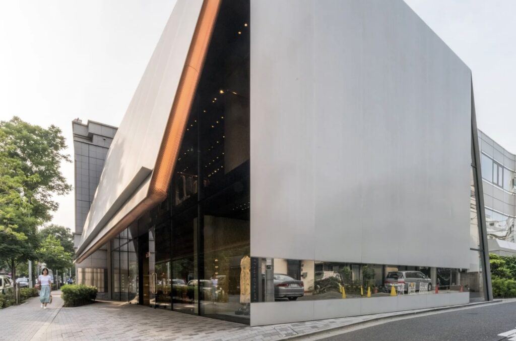 Per questa realizzazione, gli architetti hanno scelto un design che ricorda una scatola, pur senza definirla completamente. L’esterno, caratterizzato da una superficie liscia e riflettente, funziona come uno specchio che non solo cattura l’attenzione degli appassionati di design, ma affascina anche i passanti delle eleganti strade di Aoyama.