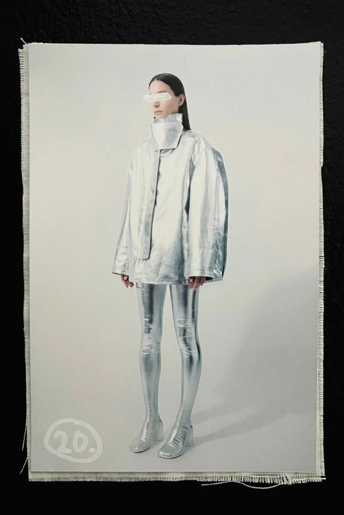Da abiti trasformati in top asimmetrici a giacche convertite in eleganti pezzi con spalle scoperte, ogni design è una manifestazione della capacità della maison di innovare e offrire versatilità. Le texture e le finiture, come bordi grezzi, cuciture esposte e tessuti usurati, evocano un’estetica che riflette l’era pre-digitale. La collezione presenta anche ingegnosi trucchi di stile, come le scarpe che somigliano a calzini.