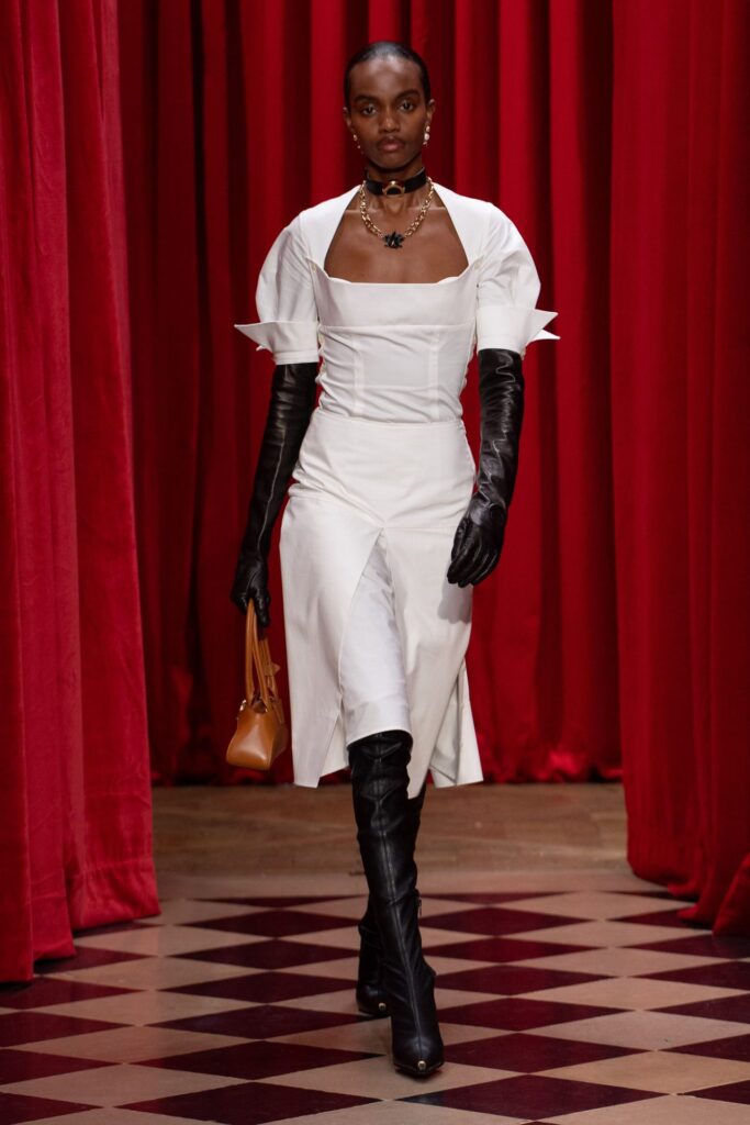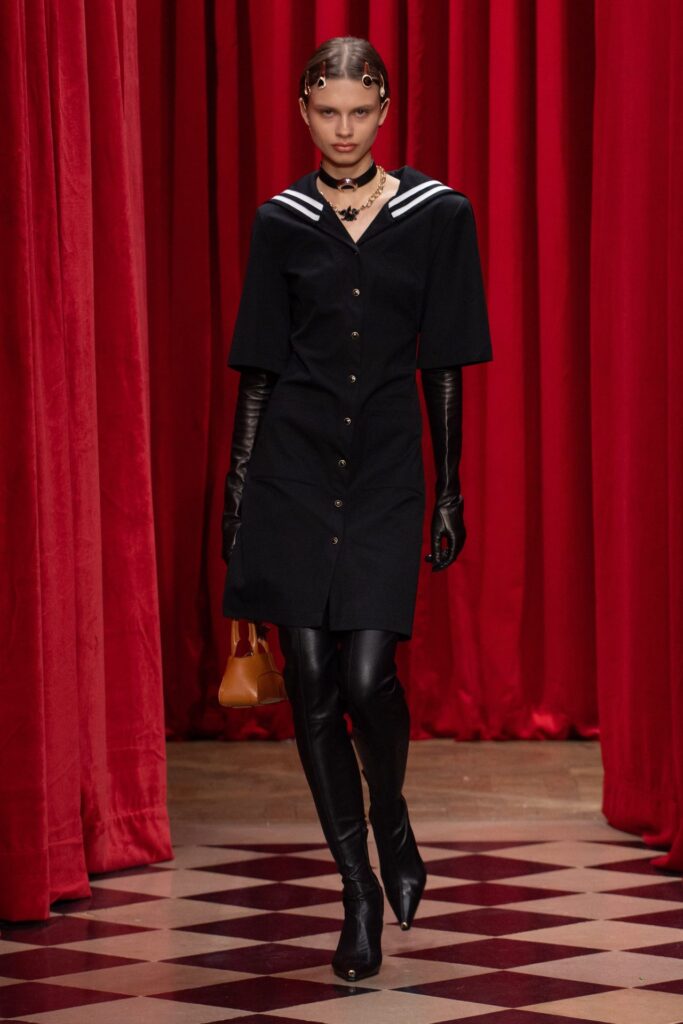 La sfilata si apre con look in pelle strutturata, dove giacche sagomate e pantaloni aderenti delineano una silhouette decisa, senza perdere la fluidità del movimento. Il richiamo alla sartoria maschile è evidente, ma Serre lo decostruisce con dettagli inaspettati: cinture formate da maniche di camicie riciclate, cappotti in pelliccia ricomposti con materiali di epoche diverse, abiti da sera realizzati partendo da sottovesti vintage.