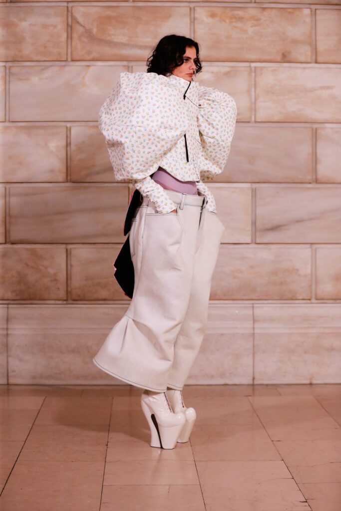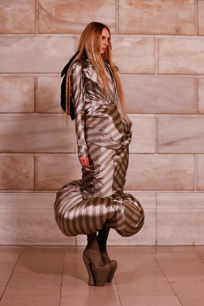 Ma questa strategia dell’eccesso funziona? Dipende. Come spettacolo, senza dubbio: nessuno costruisce una narrativa visiva come Marc Jacobs. I suoi 19 look sono stati un’ode all’immaginazione pura, più vicini a un film di Yorgos Lanthimos (Poor Things, The Lobster, The Favourite) che a una collezione prêt-à-porter. Ma come proposta moda, rimane l’interrogativo: stiamo assistendo a un’evoluzione artistica o a un sovraccarico visivo che finisce per saturare e alienare? In molti casi, i volumi erano talmente estremi da nascondere il capo anziché rivelarlo. Il rischio è che il messaggio si perda nel rumore, che il concettuale oscuri il desiderabile e che il termine “bello” diventi direttamente indecifrabile.