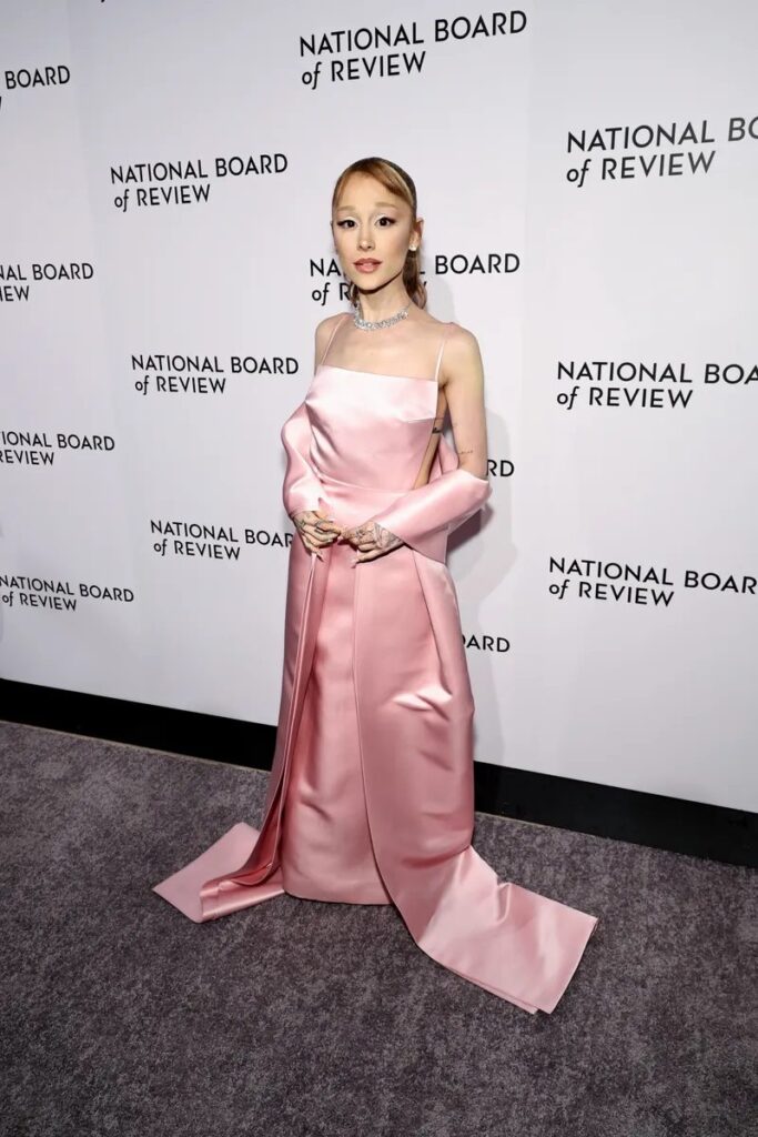 In primo piano, l’attrice e cantante Ariana Grande non ha deluso. Ha scelto un abito satinato rosa firmato Loewe, con una scollatura dritta e schiena scoperta incorniciata da bretelle che formano un quadrato. A completare il look, un mantello dello stesso colore e una vistosa collana Swarovski che ha portato il suo outfit a un altro livello.