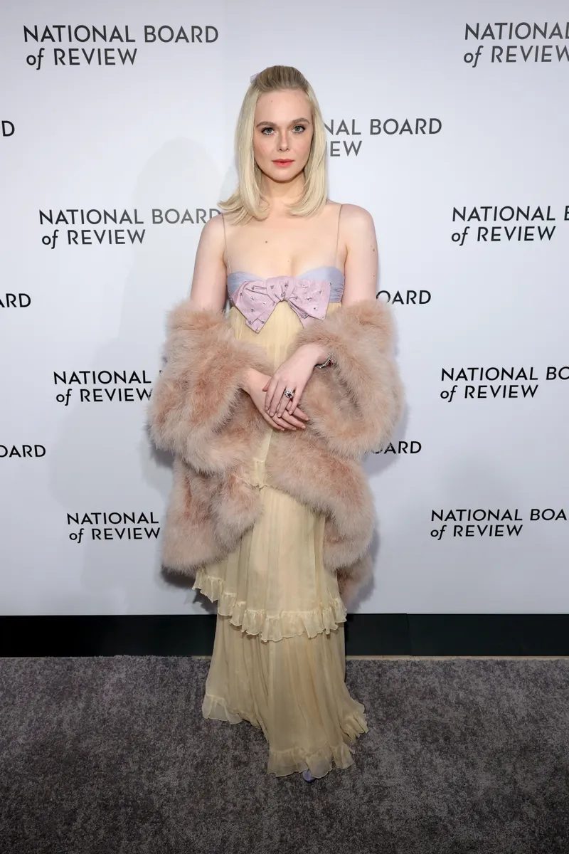 Elle Fanning ha scelto un design più colorato di Valentino, proveniente dalla collezione Resort 2025 creata da Alessandro Michele. Il suo abito, in tonalità pastello, combinava una gonna gialla con volant e un reggiseno celeste decorato con un fiocco lilla. Gli strati e i dettagli coquette hanno aggiunto un’aria fresca e giovanile al suo look.