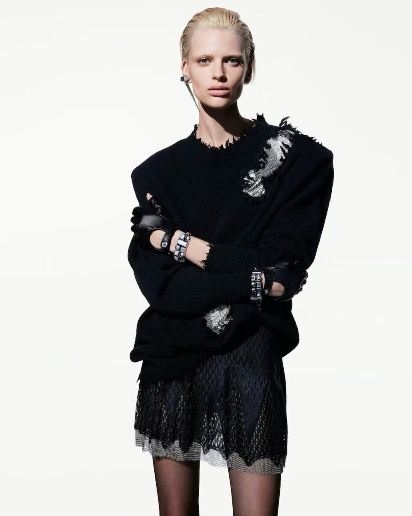 Ogni immagine è una dichiarazione. Con uno styling impeccabile, un trucco teatrale e una palette cromatica che spazia dal nero profondo all’oro liquido, Donatella trasforma questa serie visiva in un manifesto. La collezione, caratterizzata da abiti in maglia metallica, tailleur scultorei e silhouette scolpite, rievoca gli archivi iconici, ma con uno sguardo contemporaneo. Niente artifici: solo attitudine. Ed è proprio quell’attitudine che ha reso la donna Versace una figura indomabile, da Gianni fino a oggi.